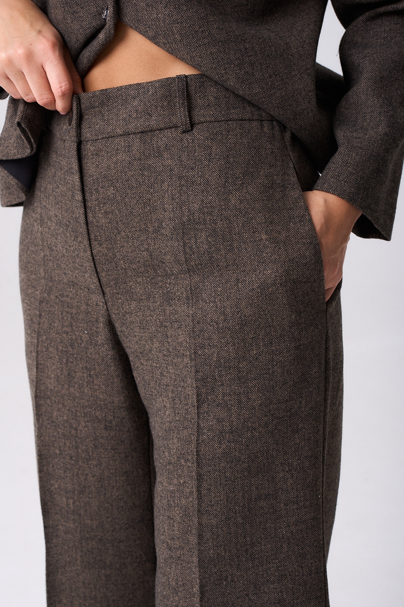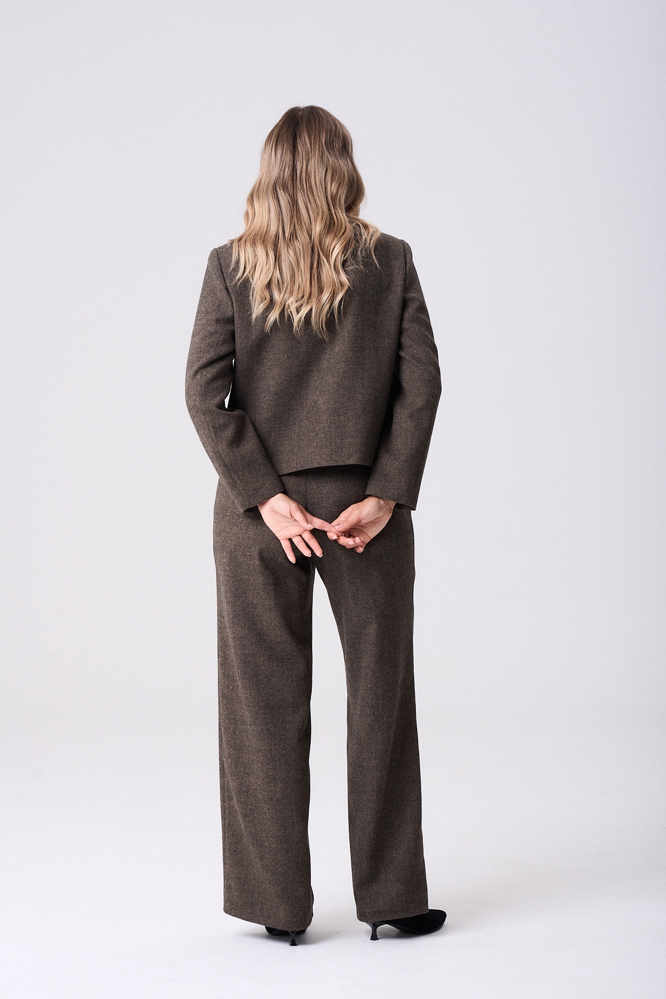 Костюм женский из костюмной ткани состоящий из жакета полуприлегающего силуэта на подкладки и брюк классического прямого кроя. Жакет с круглой горловиной и центральной застёжкой на петли и декоративные пуговицы. По полочке обработана нагрудная вытачка, в области груди настрочен клапан, закрепленный пуговицей. Спинка цельнокроеная. Рукав втачной двухшовный, длинный.