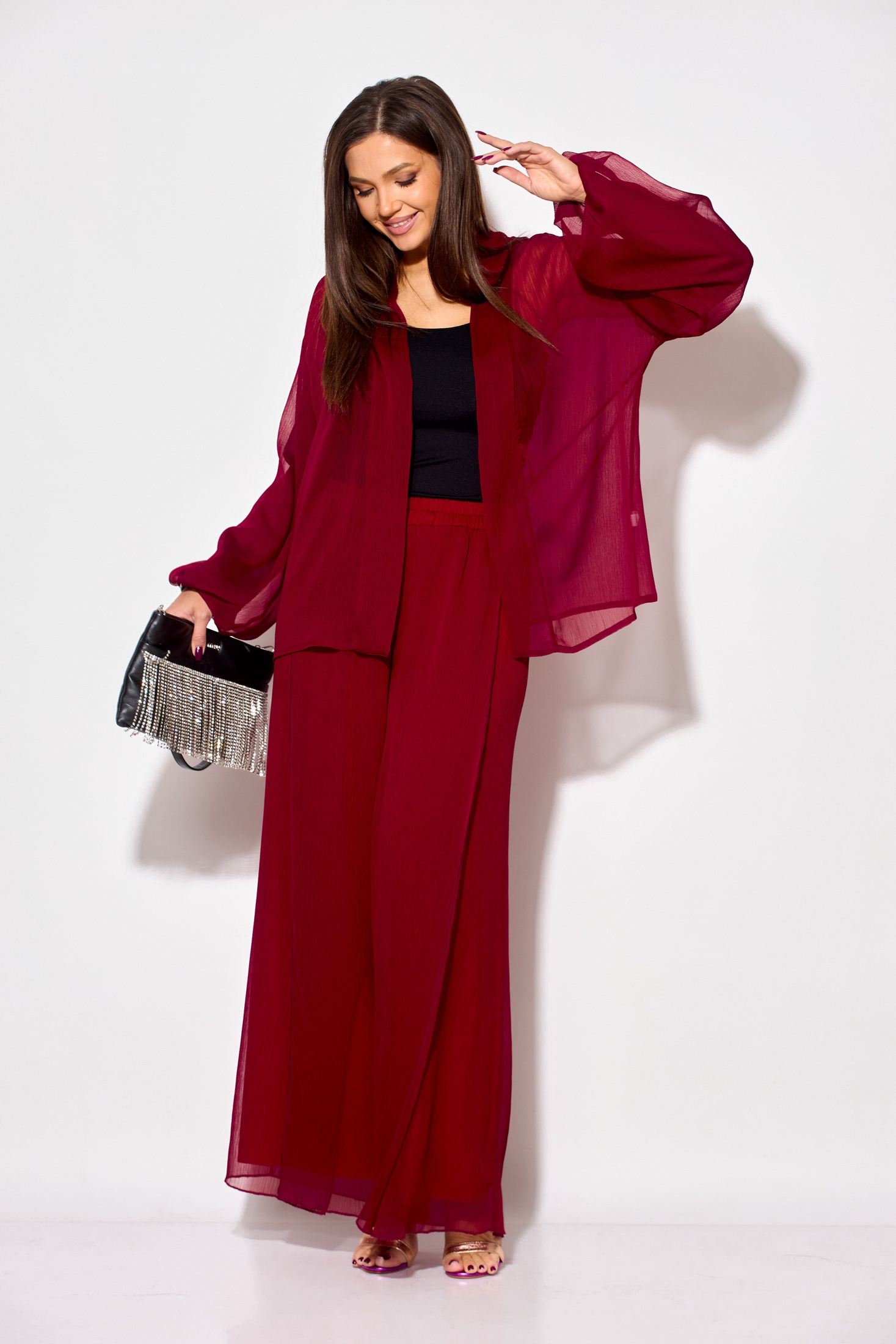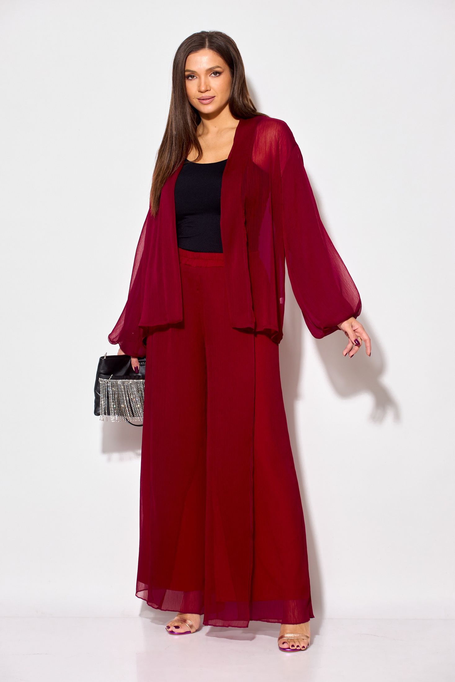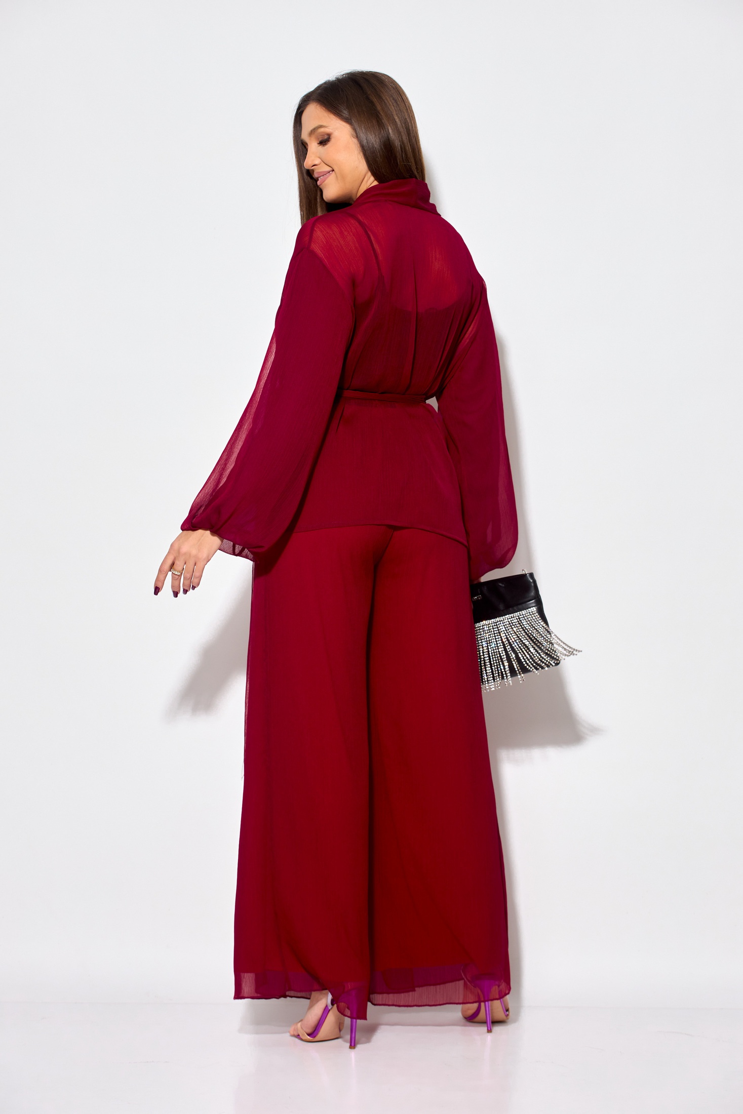 Элегантный вечерний костюм-двойка из шифона, состоящий из блузки свободного кроя и широких брюк на подкладке. Красивый и эффектный брючный костюм - это идеальный образ для особых случаев, вечерних выходов, праздничных и торжественных мероприятий, будь то корпоратив, свадьба, юбилей, выпускной, день рождения, Новый год. Блузка прямого силуэта из шифона со пущенной линией плеча. Рукав двойной, расширенный к низу со складками. По спинке и полочке идет планка. В комплекте с блузкой идет съемный пояс. На концах пояса металлизированная бахрома. Брюки прямые на трикотажной подкладке масло, с запахом по переду, пояс на резинке.Благодаря фасону и крою, костюм визуально вытянет силуэт, сделает фигуру стройнее, подчеркнет ее достоинства, скроет недостатки. Элегантный брючный костюм от Anastasia- комфорт и уверенность в себе! Длина блузки: (48-56)-61см. Длина рукава-52см. Длина брюк:(48-54)-105см., (56)-108см.
