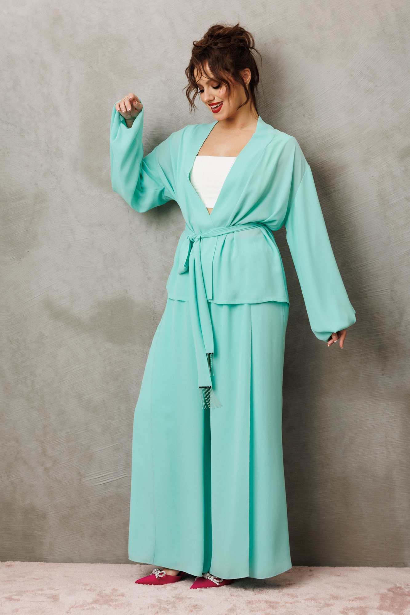 Элегантный вечерний костюм-двойка, состоящий из блузки свободного кроя и широких брюк. Красивый и эффектный брючный костюм - это идеальный образ для особых случаев, вечерних выходов, праздничных и торжественных мероприятий, будь то корпоратив, свадьба, юбилей, выпускной, день рождения, Новый год Блузка прямого силуэта со пущенной линией плеча. Рукав двойной, расширенный к низу со складками. По спинке и полочке идет планка. В комплекте с блузкой идет съемный пояс. На концах пояса металлизированная бахрома. Брюки прямые с запахом по переду, пояс на резинке.Благодаря фасону и крою, костюм визуально вытянет силуэт, сделает фигуру стройнее, подчеркнет ее достоинства, скроет недостатки. Элегантный брючный костюм от Anastasia- комфорт и уверенность в себе на любом мероприятии Длина блузки: (48-56)-61см. Длина рукава-52см. Длина брюк:(48-54)-105см., (56)-108см.