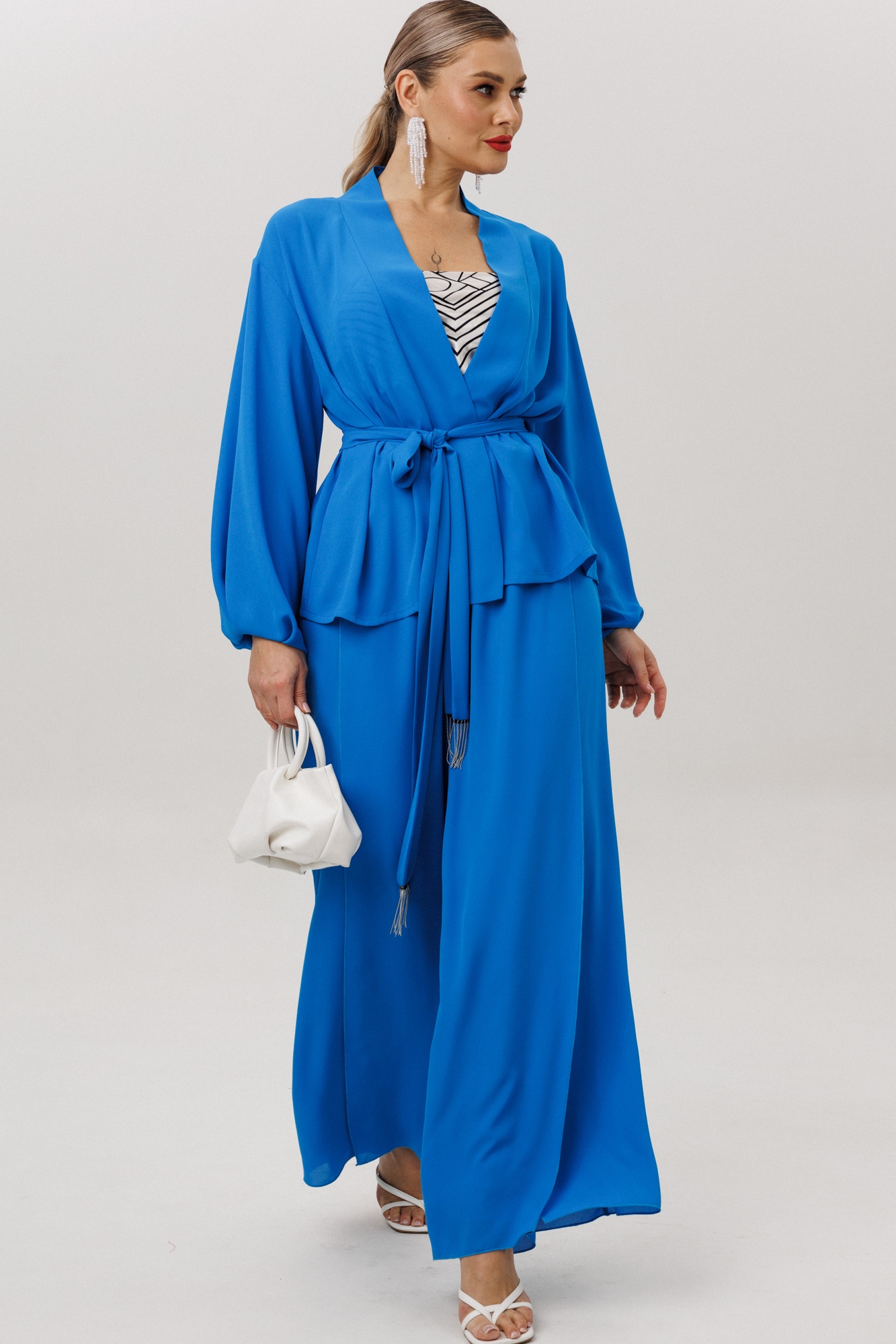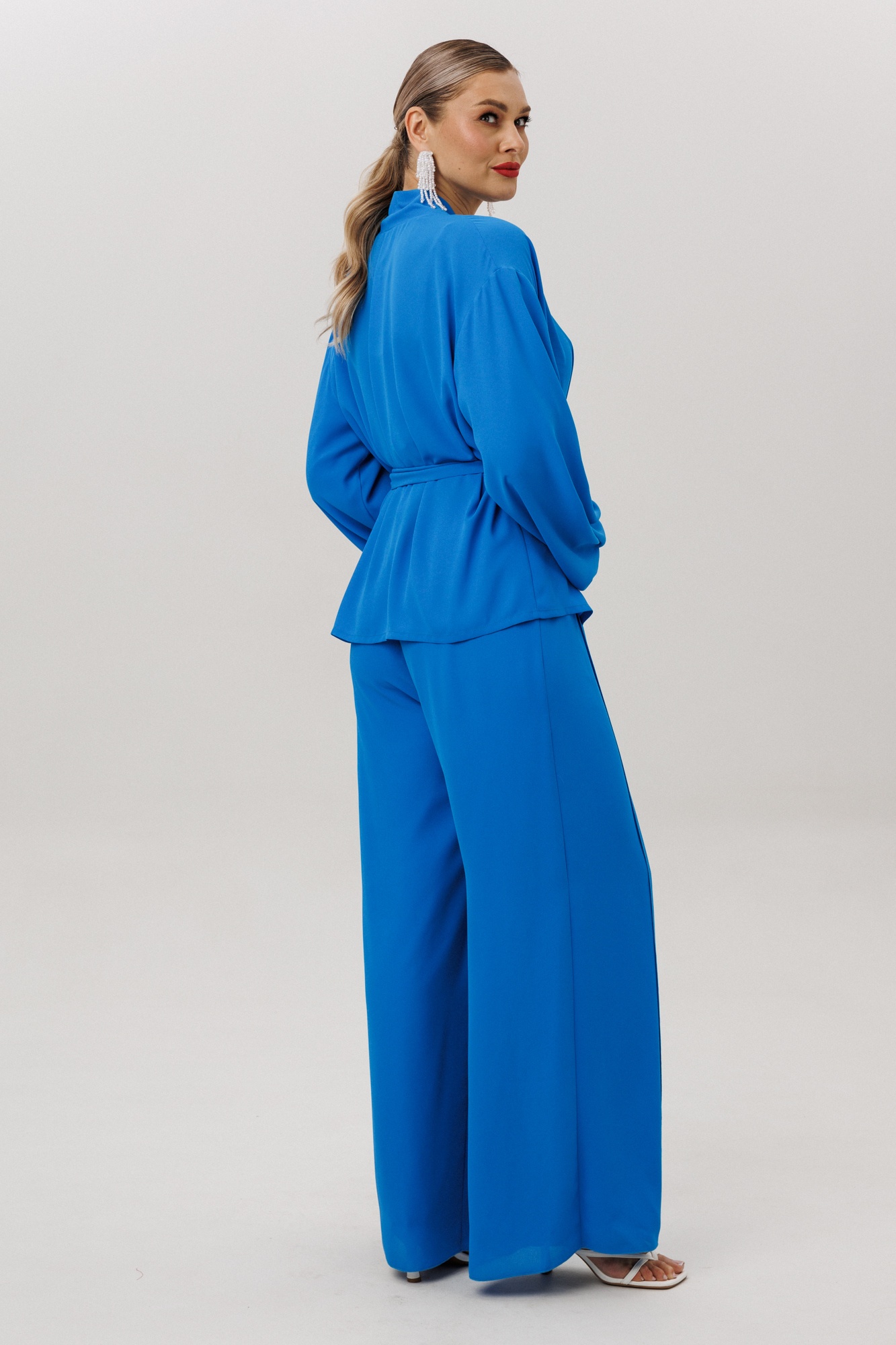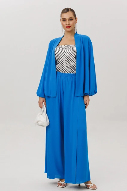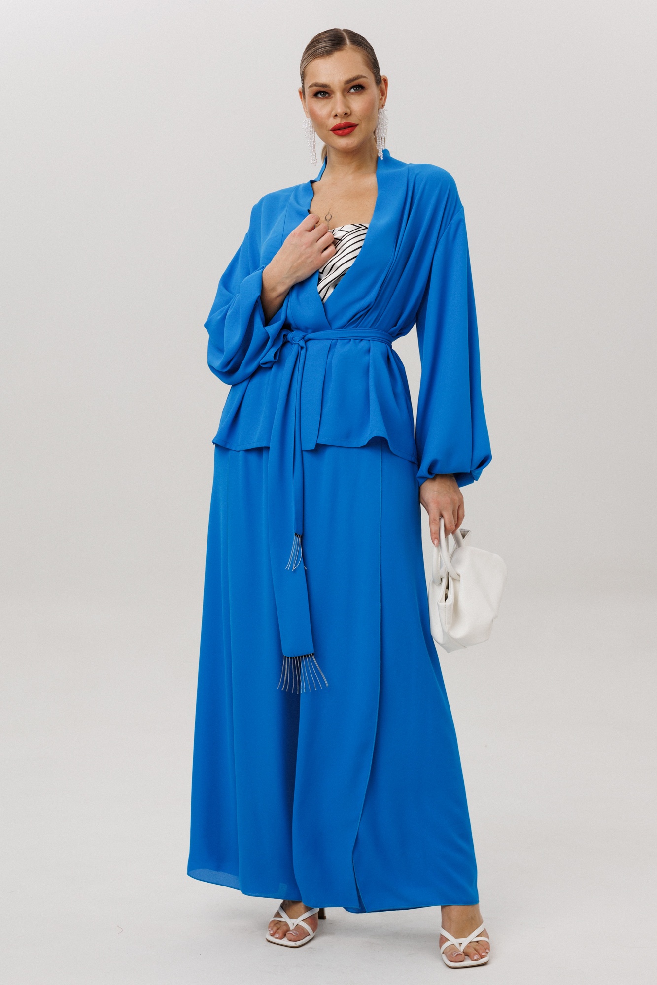 Элегантный вечерний костюм-двойка, состоящий из блузки свободного кроя и широких брюк. Красивый и эффектный брючный костюм - это идеальный образ для особых случаев, вечерних выходов, праздничных и торжественных мероприятий, будь то корпоратив, свадьба, юбилей, выпускной, день рождения, Новый год Блузка прямого силуэта со пущенной линией плеча. Рукав двойной, расширенный к низу со складками. По спинке и полочке идет планка. В комплекте с блузкой идет съемный пояс. На концах пояса металлизированная бахрома. Брюки прямые с запахом по переду, пояс на резинке.Благодаря фасону и крою, костюм визуально вытянет силуэт, сделает фигуру стройнее, подчеркнет ее достоинства, скроет недостатки. Элегантный брючный костюм от Anastasia- комфорт и уверенность в себе на любом мероприятии Длина блузки: (48-56)-61см. Длина рукава-52см. Длина брюк:(48-54)-105см., (56)-108см.