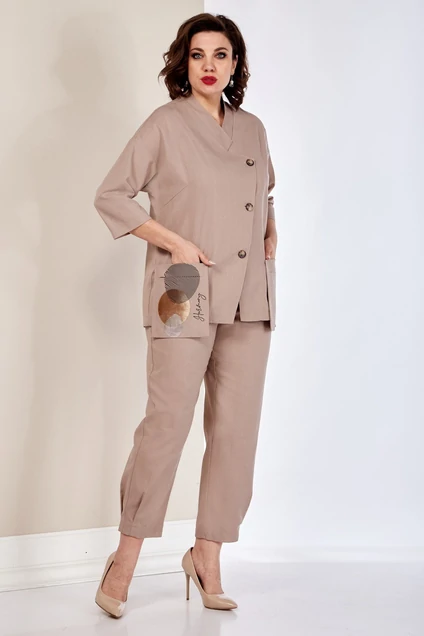 Комплект женский 2-хпредметный (жакет и брюки). Жакет из текстильной ткани прямого силуэта со спущенным плечом. По полочке идут грудовые выточки из бокового шва. Застежка ассиметричная. Воротник стойка. По спинке встречная складка. Рукав 3/4. По полочке идут отлетные накладные карманы с декором (термонаклейка). Брюки прямые, зауженные к низу за счет защипов. Пояс на резинке, по бокам карманы. Длина спинке:(48-52)-70см, (54-58)- 73см. Длина рукава:(48-58)-33см. Длина брюк (48-50) -93см, (52-58)-95см