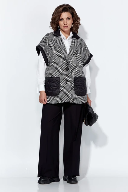 Бренд белорусской женской одежды больших размеров Anastasia представляет комплект двойку. Комплект женский 2-х предметный (жилет, брюки) станет отличным дополнением к Вашему гардеробу. Подойдет для повседневной носки (работа, офис, прогулки). Достаточно дополнить его соответствующими предметами из вашего гардероба: блузка, майка, водолазка, гольф, свитер, лонгслив, свитшот. Жилет женский из польтовой буклированной ткани в клетку без подкладки. Модель прямого силуэта. По переду клетка идет по косой. Воротник классической формы, застежка на петли и пуговицы. В качестве декора: воротник, накладные карманы и бейка проймы - из стеганной плащевой ткани. Брюки прямые со стрелками. Пояс на резинке, по бокам карманы. Благодаря своему крою и фасону костюм подчеркивает женственные формы и скрывает то, что должно быть незаметным. Это повседневный вариант на каждый день для занятий в школе или для офиса, на работу или на прогулку. Наденьте его на деловую встречу, официальное мероприятие, школьное торжество. Модель подойдёт для образа в университет или колледж. Этот предмет одежды подчеркнет вашу элегантность и сделает образ более женственным. Одежда для женщин больших размеров и не только, по отличным ценам и высокого качества - это Anastasia! Добавляете нас в любимые бренды и вы всегда будете в курсе всех акций и новинок! Новинка осень 2024! Хороших покупок от «Анастасия». Длина по спинке: (50-54)-73см, (56-60)-76см. Длина брюк (50-54) -101см, (56-60)-104см Низ: Полиэстер-80%, Вискоза-15%, Сандекс-5%