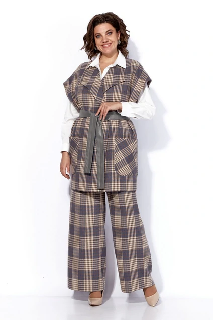 Бренд белорусской женской одежды больших размеров Anastasia представляет комплект двойку. Костюм женский 2-х предметный (жилет, брюки) станет отличным дополнением к Вашему гардеробу. Подойдет для повседневной носки (работа, офис, прогулки). Достаточно дополнить его соответствующими предметами из вашего гардероба: блузка, майка, водолазка, гольф, свитер, лонгслив, свитшот. Жилет женский из текстильной ткани в клетку без подкладки. Модель прямого силуэта с закпахом, со съемным поясом из эко кожи. По полочке идут накладные карманы. Брюки прямые, пояс на резинке, по бокам карманы. Благодаря своему крою и фасону костюм подчеркивает женственные формы и скрывает то, что должно быть незаметным. Это повседневный вариант на каждый день для занятий в школе или для офиса, на работу или на прогулку. Наденьте его на деловую встречу, официальное мероприятие, школьное торжество. Модель подойдёт для образа в университет или колледж. Этот предмет одежды подчеркнет вашу элегантность и сделает образ более женственным. Одежда для женщин больших размеров и не только, по отличным ценам и высокого качества - это Anastasia! Добавляете нас в любимые бренды и вы всегда будете в курсе всех акций и новинок! Новинка осень 2024! Хороших покупок от «Анастасия». Длина по спинке: (50-58)-90см. Длина брюк (50-54) -100см, (56-58)-1