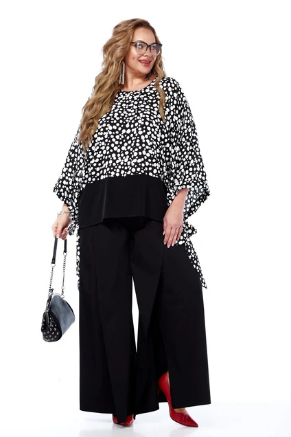 Бренд белорусской женской одежды больших размеров Anastasia представляет комплект двойку. ОН станет отличным дополнением к Вашему гардеробу. Подойдет для повседневной носки (работа, офис, прогулки) , так и на торжественное мероприятие, корпоратив. Комплект женский 2-х предметный(блузка, брюки). Модель из трех видов ткани: верх блузочная ткань и масло, низ из хлопковой блузочной ткани. Блузка в виде туники с цельнокроеным рукавом, по низу рукава идет манжет и завязка. По низу блузы пояс-отделка из "масла". Брюки прямые, с запахом по переду, пояс на резинке. Этот предмет комплект подчеркнет вашу элегантность и сделает образ более женственным. Одежда для женщин больших размеров и не только, по отличным ценам и высокого качества - это Anastasia! Длина блузы: (50-54)-65см., (58-60)-69см. Длина рукава (от горловины): (50-54)-58см, (56-60)-60см. Длина брюк:(50-54)-103см., (56-60)-106см.