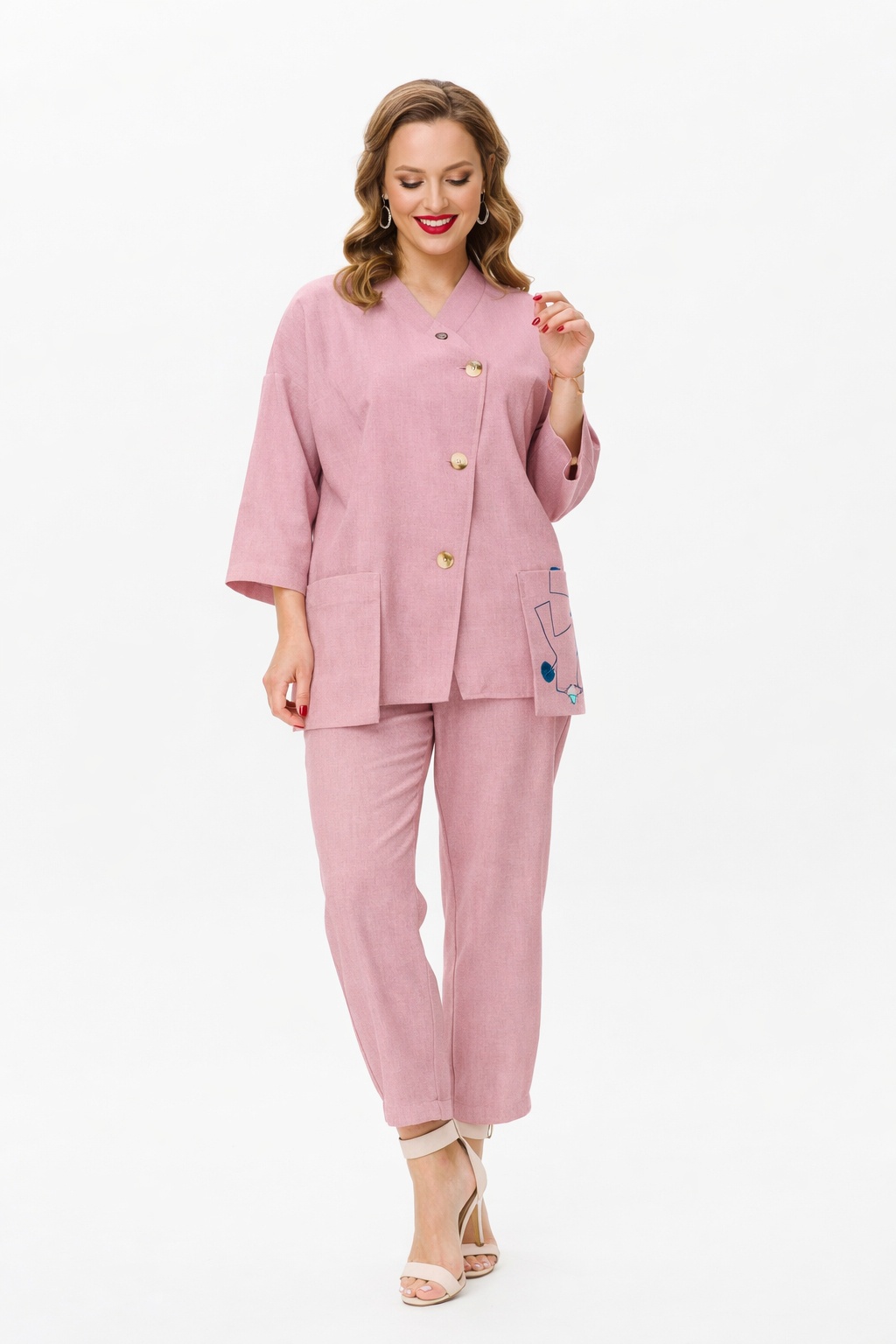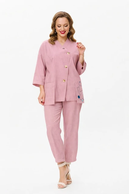 Костюм брючный 1202 пыльная роза Anastasia — это оригинальный женский комплект от бренда Anastasia, выполненный из полиэстера, хлопка, льна и вискозы. Жакет свободного силуэта с асимметричной застежкой на пуговицы и накладными карманами, один из которых украшен декоративным принтом. Этот стильный костюм идеально подходит для повседневной носки, офиса и прогулок. Длина спинки составляет 70 см, длина рукава — 33 см, а длина брюк — до 95 см в зависимости от размера. Брюки укороченные с комфортной резинкой на поясе и боковыми карманами, что обеспечивает удобную посадку и передвижение. Коллекция бренда Anastasia предлагает универсальный вариант, отлично сочетающий стиль и комфорт для межсезонного использования. Цвет костюма 'пыльная роза' добавляет женственности и актуальности.