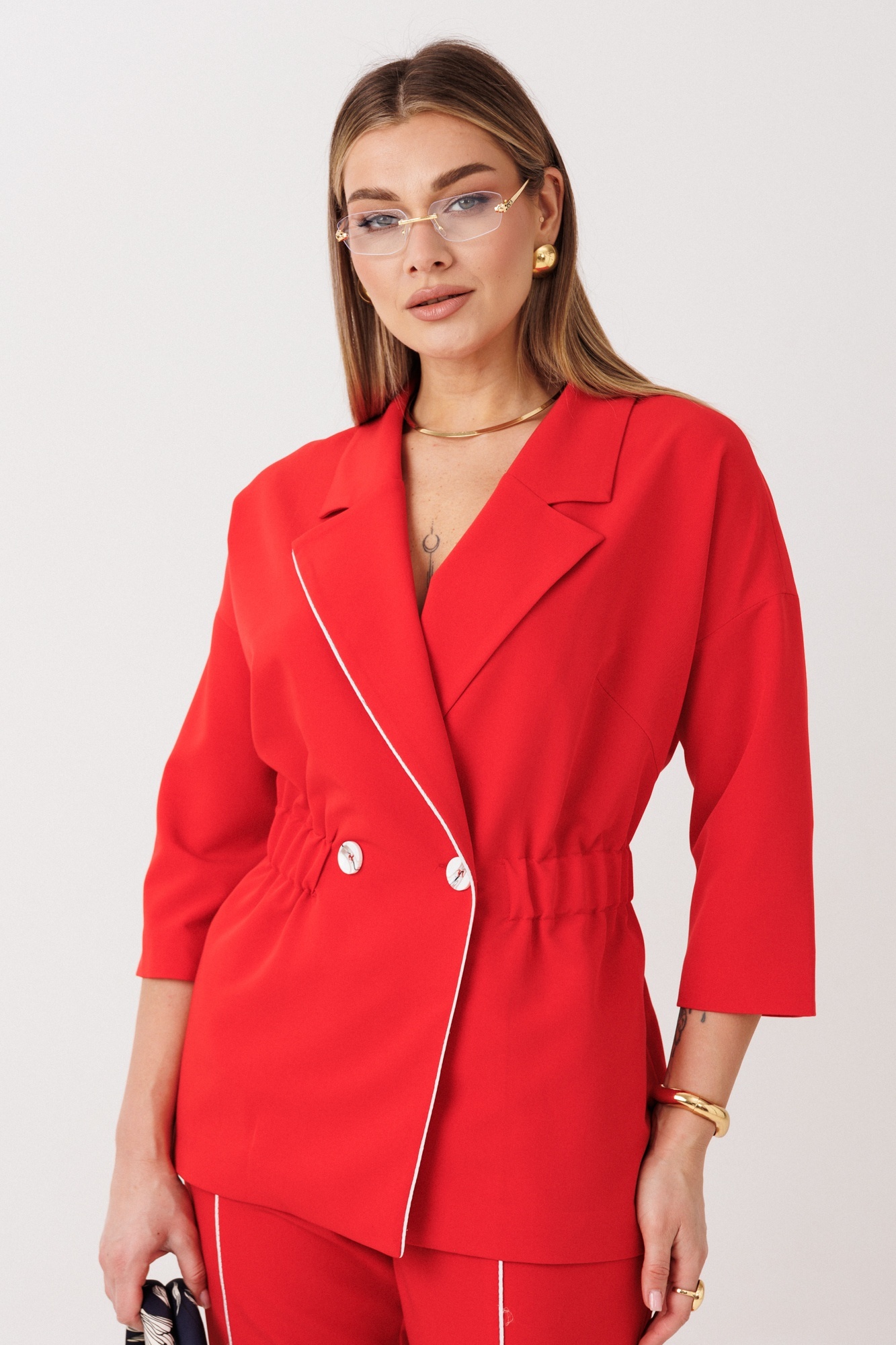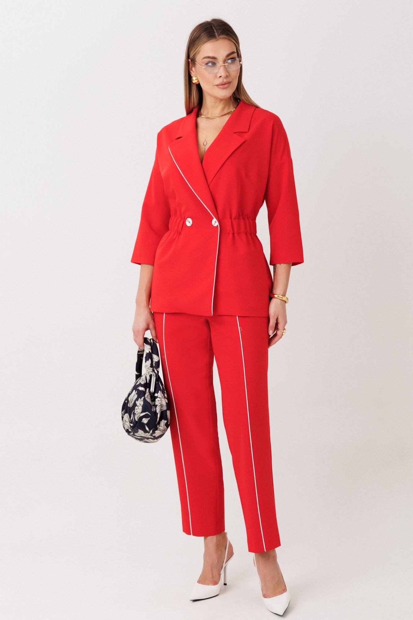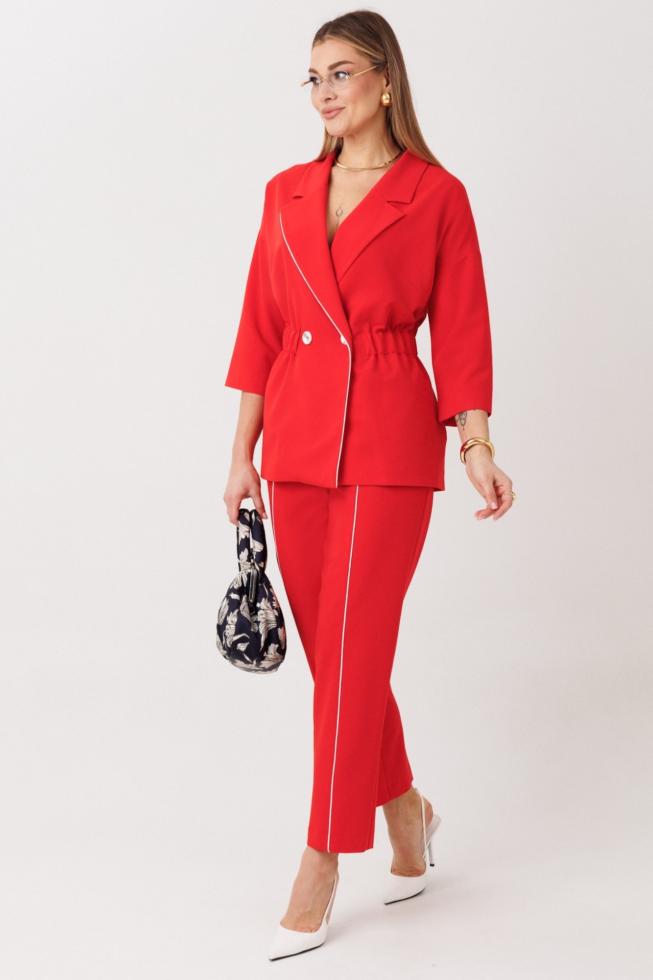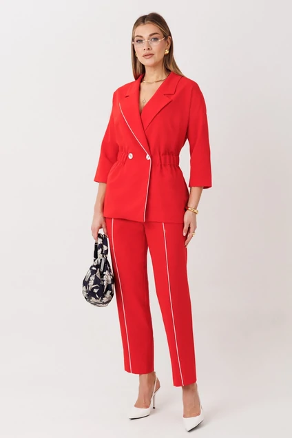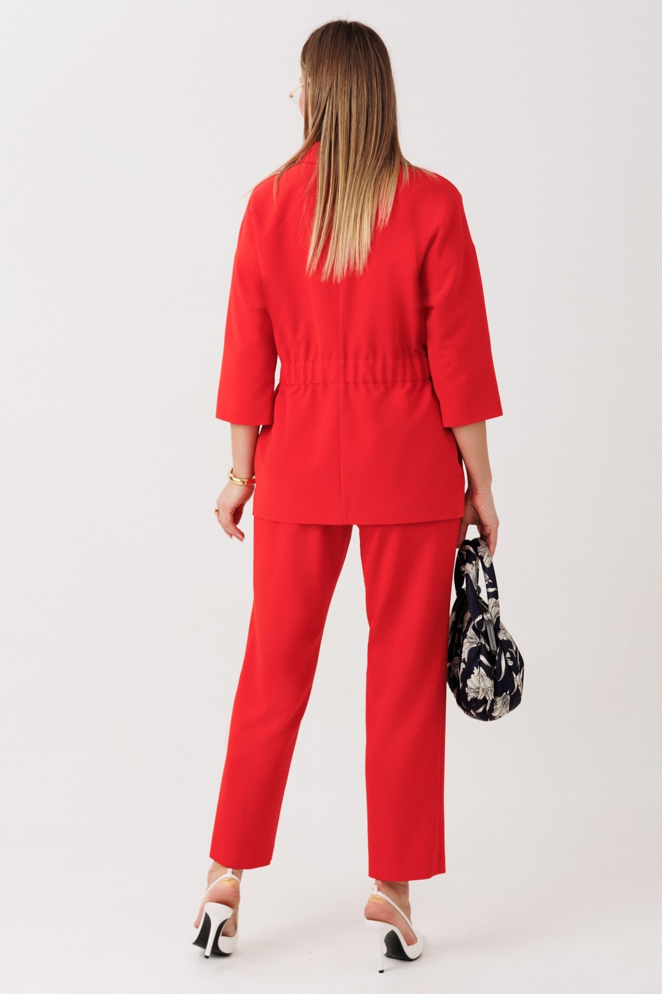 Костюм брючный 1324 красный Anastasia от бренда Anastasia — стильное решение для современной женщины. Коллекция бренда представлена комплектом из жакета и брюк, выполненным из полиэстера, вискозы и спандекса, что обеспечивает комфорт и долговечность. Жакет со спущенным плечом и двубортной застежкой имеет воротник английского типа и боковые карманы, а также украшен контрастным кантом. Приталенный силуэт достигается за счет кулиски с резинкой, обеспечивая комфорт в течение дня. Брюки зауженного кроя на резинке также дополнены кантовой вставкой и идеально подходят для офиса или прогулок. Костюм представлен в ярком красном цвете, который подчеркнет вашу индивидуальность. Длина жакета по спинке варьируется от 69 до 71 см (смотрите раздел Параметры), а длина рукава составляет 32 см, что делает его подходящим для любого сезона.