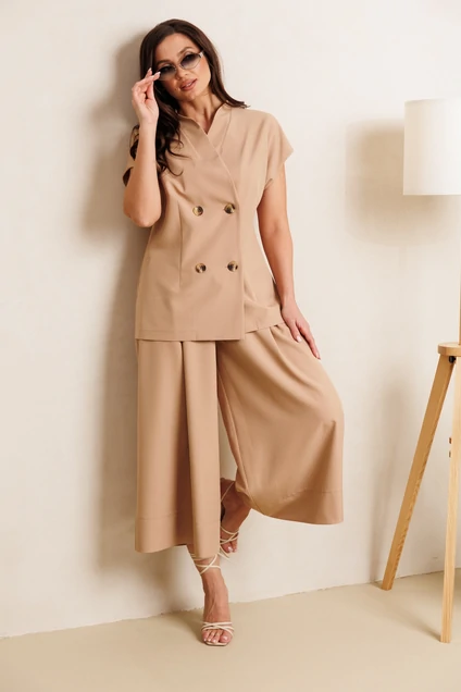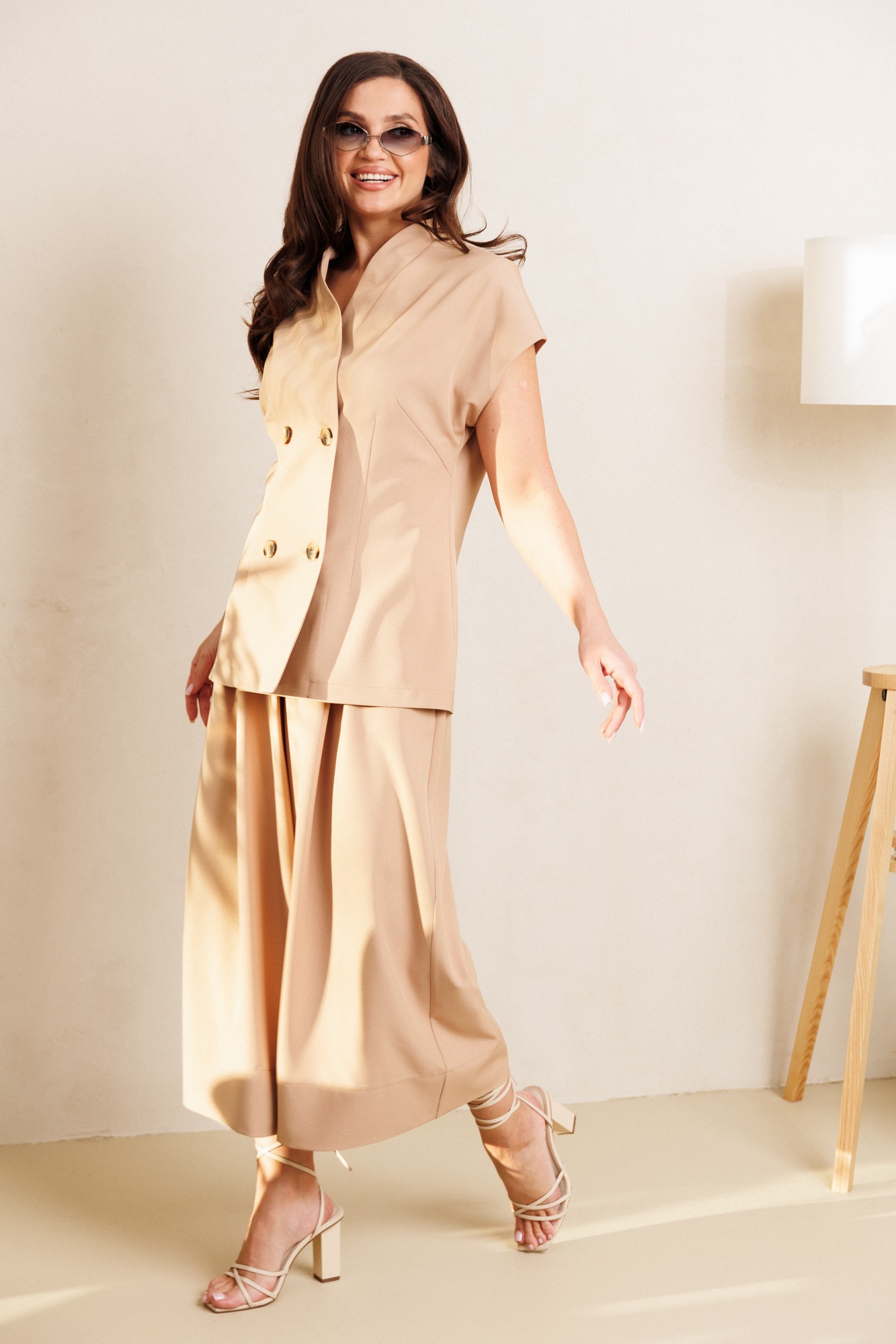 Костюм брючный 1330 бежевый Anastasia – это модное решение, идеально подходящее для повседневного гардероба. Коллекция бренда Anastasia предлагает стильный женский костюм двойку, состоящий из жилета и юбки-брюк. Изготовленный из сочетания полиэстера, вискозы и спандекса, костюм обладает хорошей эластичностью и комфортом. Бежевый цвет и классический фасон с двухбортной застежкой и спущенным плечом делают его универсальным элементом для рабочего и офисного стиля. Широкие юбки-брюки длиной 85 см создают элегантный силуэт, а длина жилета по спинке составляет 72-74 см в зависимости от размера. Лёгкая потайная молния и акцентные пуговицы придают особый шарм. Идеальный вариант для офисной работы или прогулок в любой сезон.