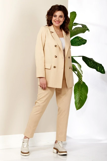 Комплект женский 2-х предметный из текстильной ткани под "лен" (жакет и брюки). Жакет полуприлегающего силуэта: бочок с выточкой по полочеке, по спинке средний шов. Застежка двухбортная, карман клапан "обманка". Рукав двухшовный. Брюки зауженные к низу, пояс на резинке, по бока карманы. Длина жакета (по спинке): (50-52)- 73см ., (54-56)-74см. Длина рукава: (50-52)-61см.,(54-56)-62см. Длина брюк: (50-56):97см.