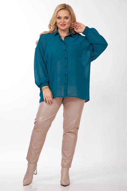 Копмплект женский 2-х предметный (блузка, брюки).Блузка женская, прямого силуэта, из шифоновой ткани со спущенным плечом. Застежка модели на планку и пуговицы, воротник на стойке, по полочке идет накладной карман, манжет рукава на резинке. Брюки из ЭКО-кожи зауженные к низу, пояс на резинке, по бокам карманы. Длина (по спинке): (46-50)-72см., (52-56)-74см., Длина рукава (с манжетой): (46-56)-50см. Длина брюк: (46-50)-95см., (52-56)-96см.