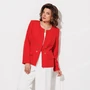 Костюм состоит из жакета и брюк, выполнен из ткани в полоску и однотонной ткани. Жакет полуприлегающего силуэта, длиной чуть ниже линии бедер. Жакет с застежками на один ряд петель и пуговиц, и воротником притачного типа. Полочка и спинка с рельефами от плечевого шва. Рукав цельнокроеный, короткий. Брюки прямые, длинные, свободные в верхней части, со стрелками. По передним половинам выполнены карманы. Брюки на притачном поясе с эластичной тесьмой.