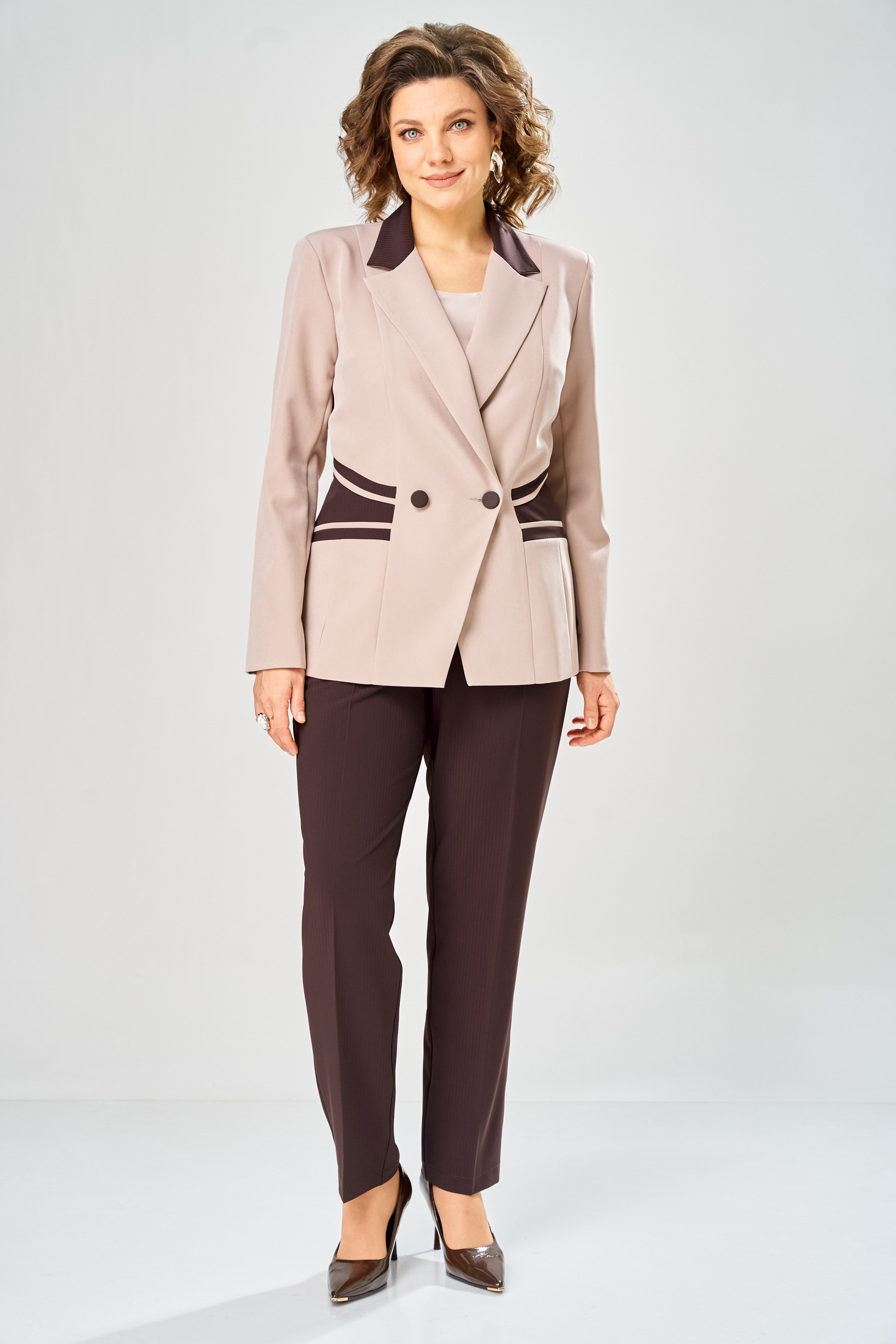 Костюм брючный 1315 коричневый + пудра ANASTASIA MAK — это идеальный выбор для торжественных и офисных мероприятий. Коллекция бренда ANASTASIA MAK воплощает современный стиль с полуприлегающим силуэтом. Жакет с двубортной застежкой и V-образной горловиной придает элегантность образу. Брюки классической длины обеспечивают комфорт благодаря эластичной тесьме на поясе. Изготовленный из костюмной ткани с эластаном, костюм подходит для межсезонья, предлагая лёгкость и стиль. Контрастная отделка добавляет актуальности, а коричнево-пудровая палитра подчеркивает современность и универсальность. Прямые линии и наклонные карманы создают изящный фасон, который безупречно впишется в любой гардероб.