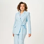 Костюм состоит из жакета и брюк. Костюм выполнен из однотонной ткани. Жакет прямого силуэта, без подкладки. Полочка жакета с вертикальными рельефами и двубортной застежкой на две пуговицы. Горловина V-образной формы. На нижней части полочки выполнены накладные карманы. Спинка со средним швом и отрезными бочками. Рукав длинный, втачной, двухшовный. Брюки со стрелками, длиной до косточки. В верхней части брюки прилегающие, в колене свободные и к низу зауженные. По передним половинам обработаны карманы, в среднем шве застежка на молнию. На задней половине обработаны талиевые вытачки. Брюки на притачном поясе с эластичной тесьмой и шлевками. Застежка по поясу на петлю и пуговицу.