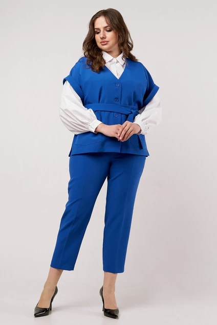 Комплект женский тройка, состоит из брюк, жилета и блузки. Жилет прямого силуэта, с V-образной горловиной, спущенная пройма с притачным манжетом, застежка обработана на петли пуговицы, на переде жилета накладные карманы. Спинка прямая, по боковым швам обработаны разрезы, изделие со съемным поясом. Брюки женские, свободного кроя, на притачном поясе со шлевками и эластичной тесьмой сзади, с застежкой спереди на тесьму молнию и петлю пуговицу. Передние половинки с двумя наклонными боковыми карманами и складками. Задние половинки брюк с талевыми вытачками. Состав: 94%-полиэстер 6%-спандекс