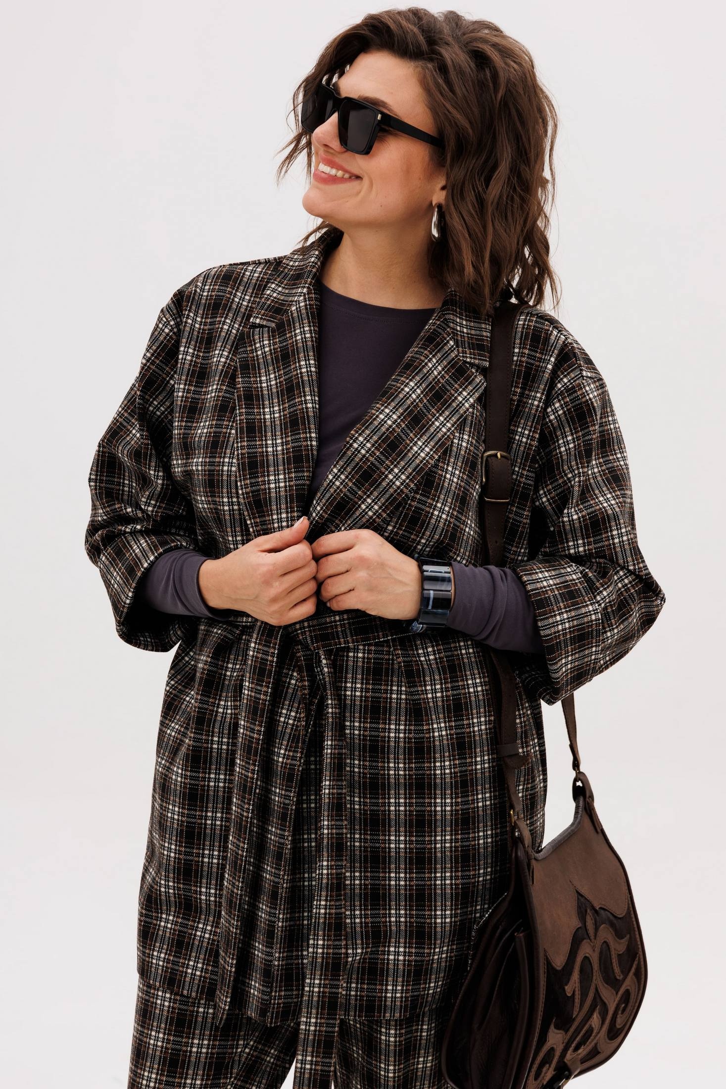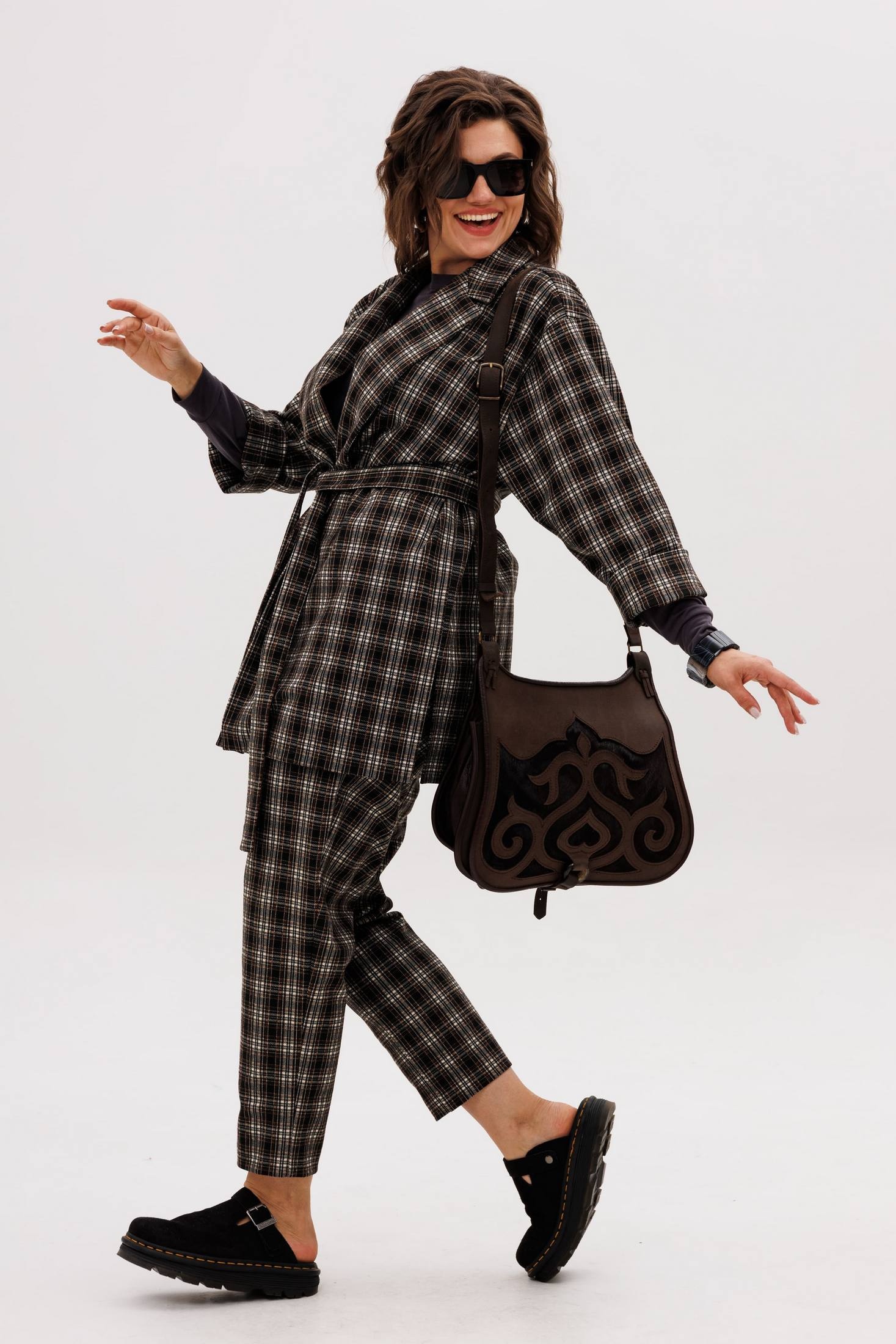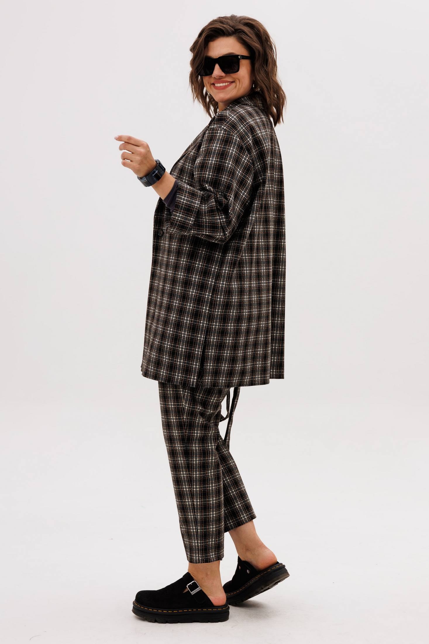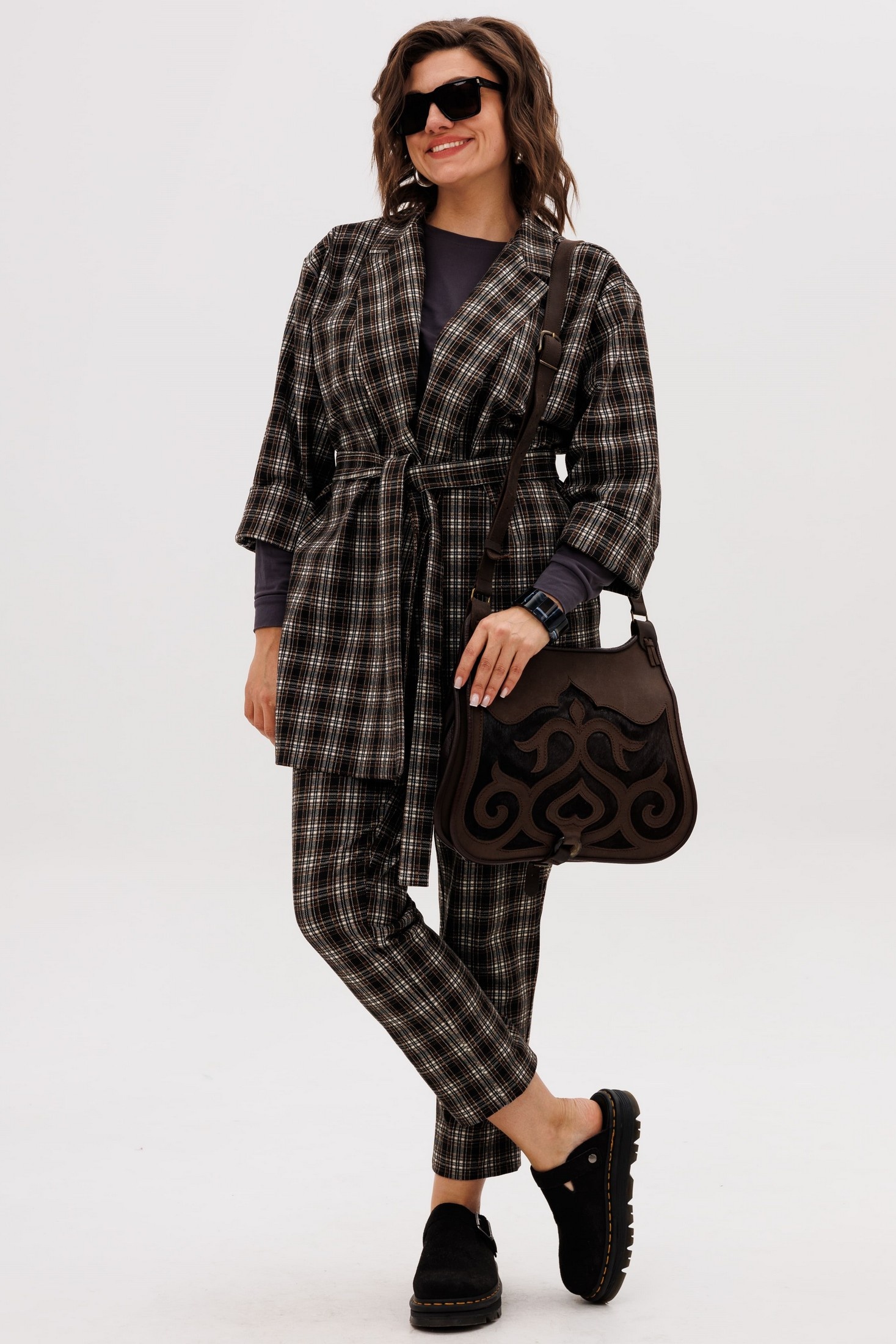 Костюм из утеплённого трикотажного полотна, выполненный в цвете «каштановая история» с классическим клетчатым принтом. Этот актуальный предмет гардероба обладает вневременной притягательностью, оставаясь стильным независимо от сменяющихся тенденций.