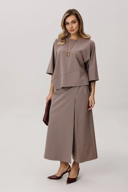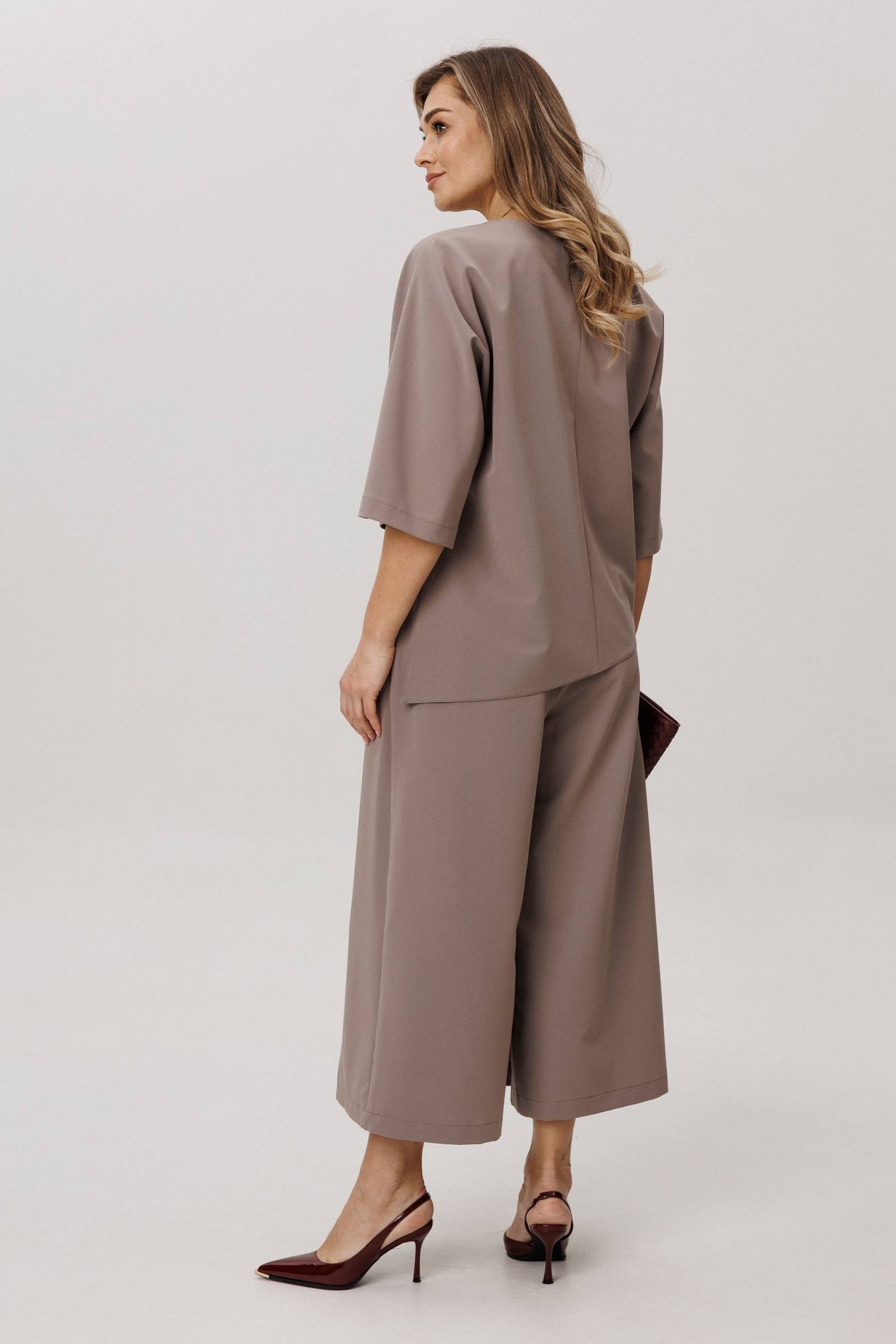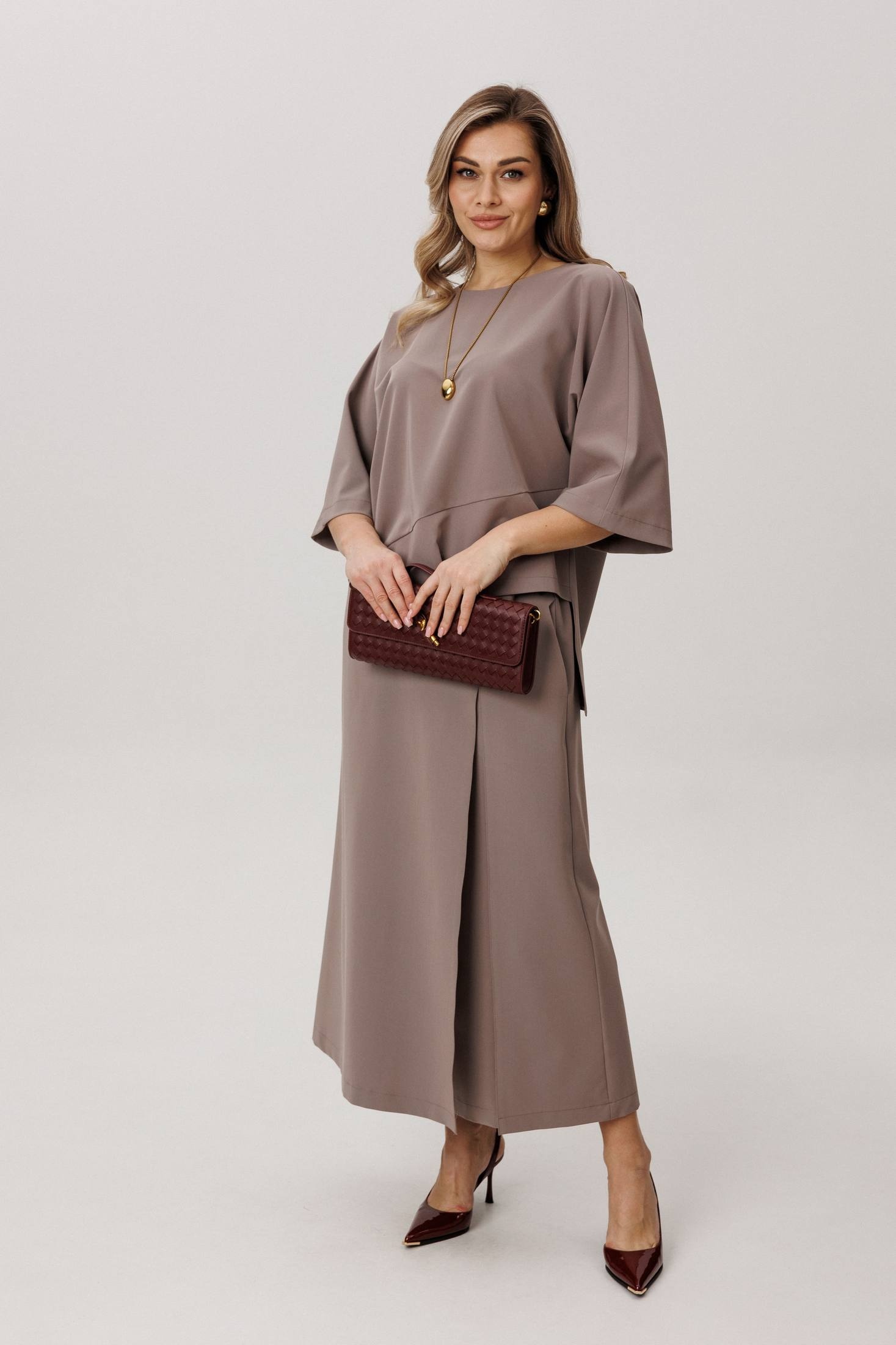 Сочетание строгого силуэта и лёгкой небрежности в цвете «пустынная гладь». Блузон свободно обрисовывает фигуру, смягчая линии цельнокроеными рукавами. А его главная деталь - фигурный, словно волной очерченный низ, который придаёт статичному крою неожиданную динамику. Низ костюма это юбка-брюки-кюлоты на высокой талии, струящиеся и расклешённые. Модель на запах с мягкими складками создаёт ощущение простора и лёгкости, а скрытые, фигурные карманы в швах берегут чистоту линий. Этот ансамбль от Анелли дышит той особой роскошью, что заключена в безупречной свободе и универсальности. Он готов стать центром вечернего праздника, но с той же уверенностью будет сопровождать вас в будни, будь то деловая встреча или прогулка по городу. И каждая вещь, самостоятельно сочетаясь с другими предметами гардероба, раскрывается с новой стороны, предлагая бесконечные возможности для стиля. Приобрести юбку-кюлоты можно отдельно, артикул 1783.