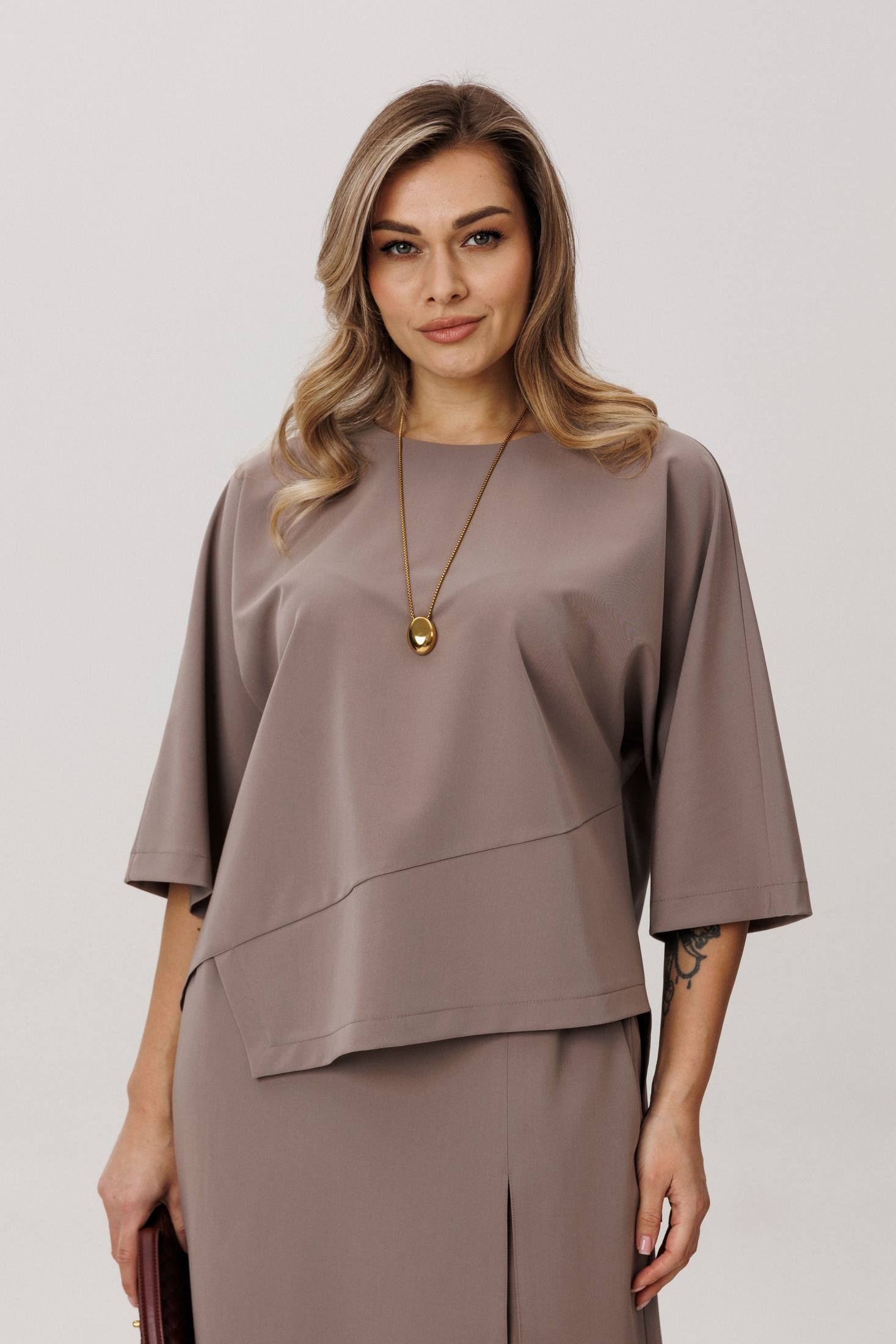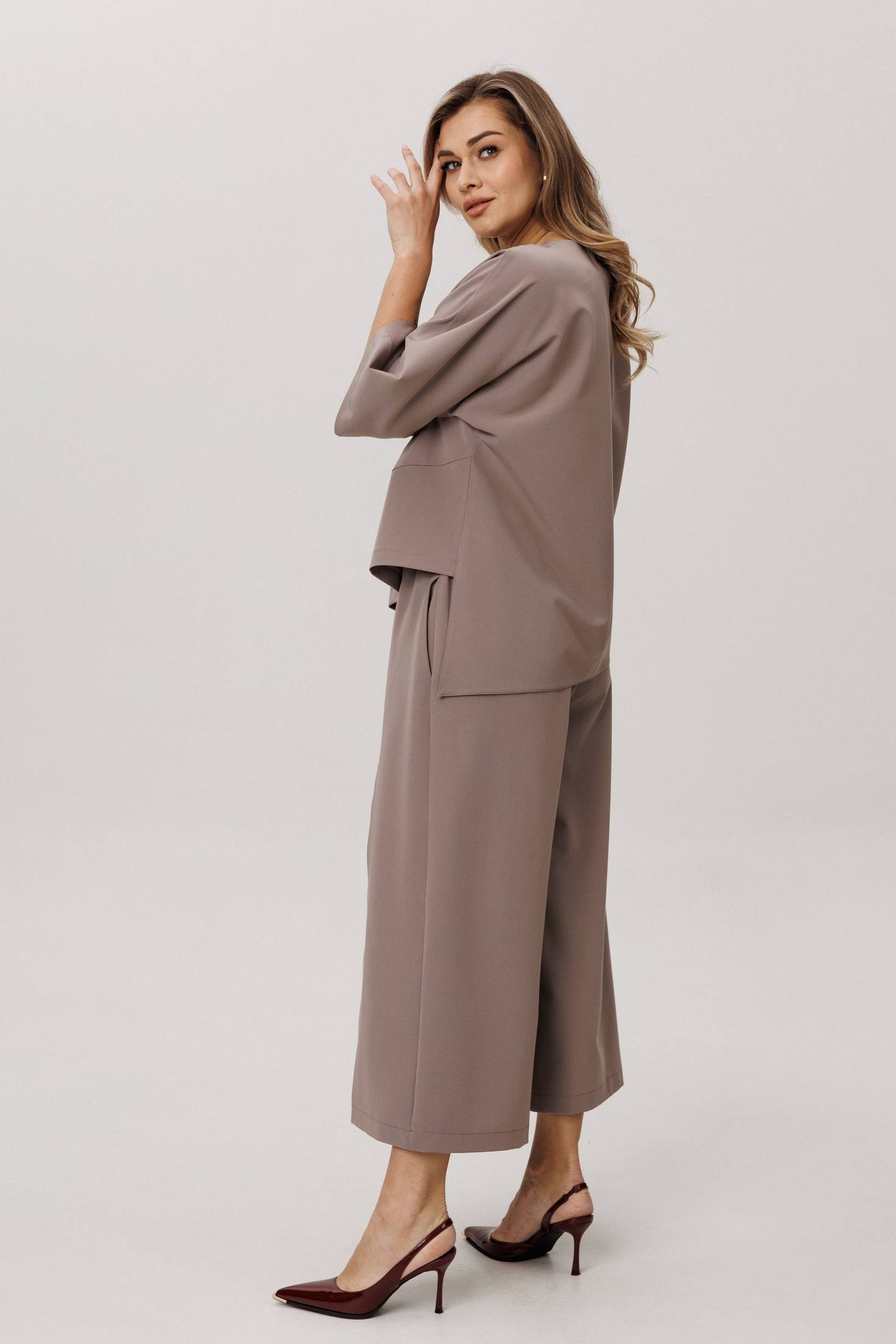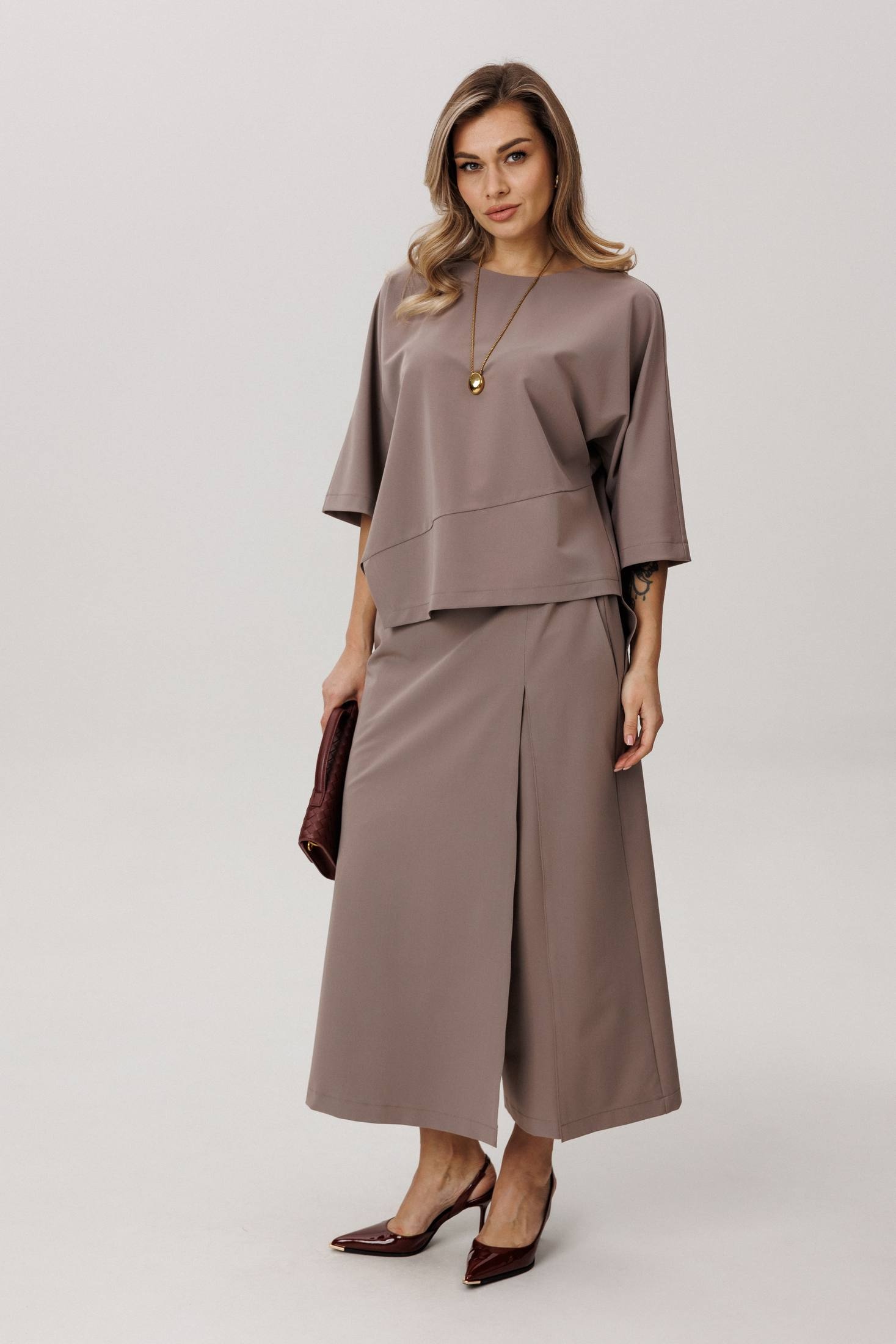 Сочетание строгого силуэта и лёгкой небрежности в цвете «пустынная гладь». Блузон свободно обрисовывает фигуру, смягчая линии цельнокроеными рукавами. А его главная деталь - фигурный, словно волной очерченный низ, который придаёт статичному крою неожиданную динамику. Низ костюма это юбка-брюки-кюлоты на высокой талии, струящиеся и расклешённые. Модель на запах с мягкими складками создаёт ощущение простора и лёгкости, а скрытые, фигурные карманы в швах берегут чистоту линий. Этот ансамбль от Анелли дышит той особой роскошью, что заключена в безупречной свободе и универсальности. Он готов стать центром вечернего праздника, но с той же уверенностью будет сопровождать вас в будни, будь то деловая встреча или прогулка по городу. И каждая вещь, самостоятельно сочетаясь с другими предметами гардероба, раскрывается с новой стороны, предлагая бесконечные возможности для стиля. Приобрести юбку-кюлоты можно отдельно, артикул 1783.