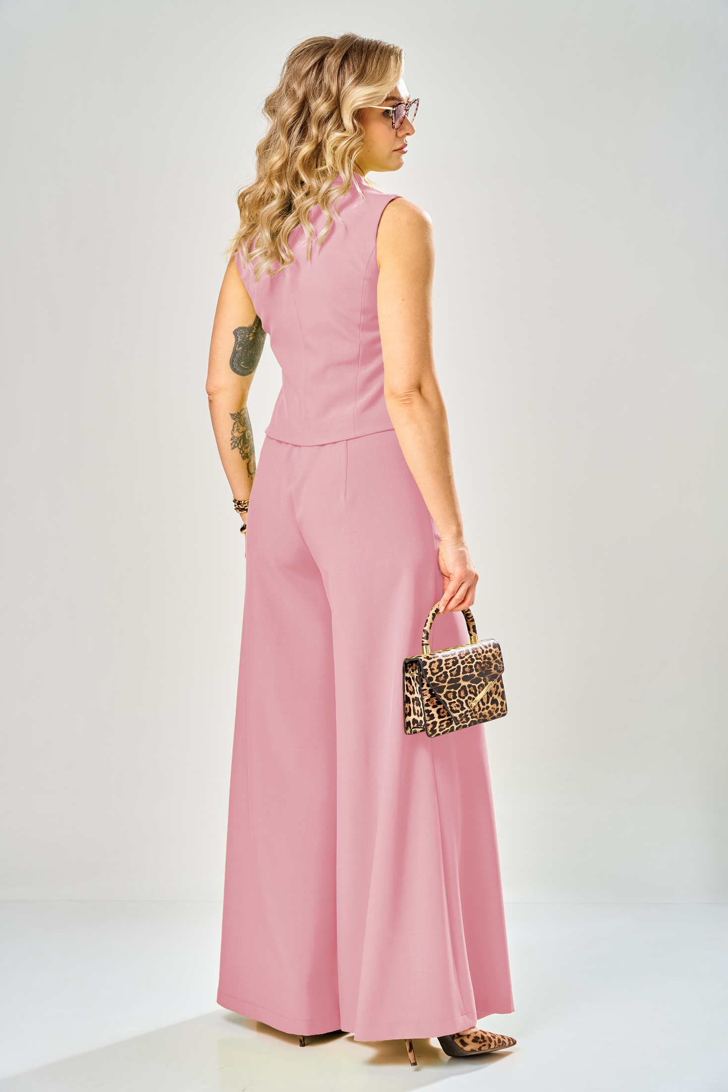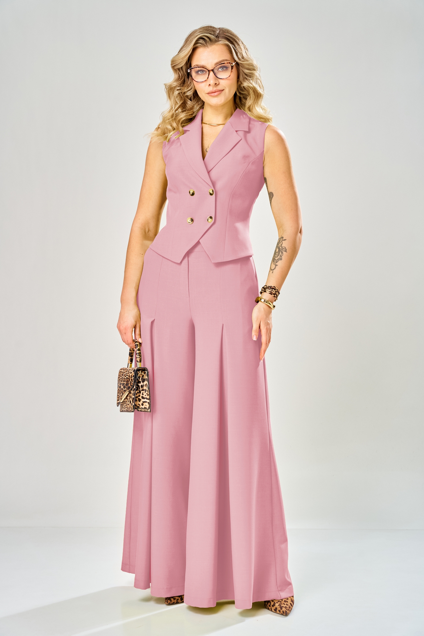 Костюм брючный 1011 полевая роза ARTELLA сочетает в себе утонченность и практичность. Коллекция бренда ARTELLA предлагает уникальное сочетание фасонов: брючный костюм с жилетом и палаццо. Изделие выполнено из высококачественной текстильной ткани с содержанием полиэстера, вискозы и спандекса, обеспечивающей комфорт на протяжении всего дня. Укороченный жилет с фигурной линией низа и двубортной застежкой подчеркнет вашу индивидуальность. Брюки-палаццо с эластичным поясом и застежкой на молнию добавят свободы движений. Карманы, застежки и рельефы делают костюм функциональным и стильным. Идеальный выбор для весеннего или летнего сезона, этот костюм в нежно-розовом оттенке подчеркнет вашу женственность. Длина жилета по спинке составляет 50-53 см, а длина брюк — 115 см.