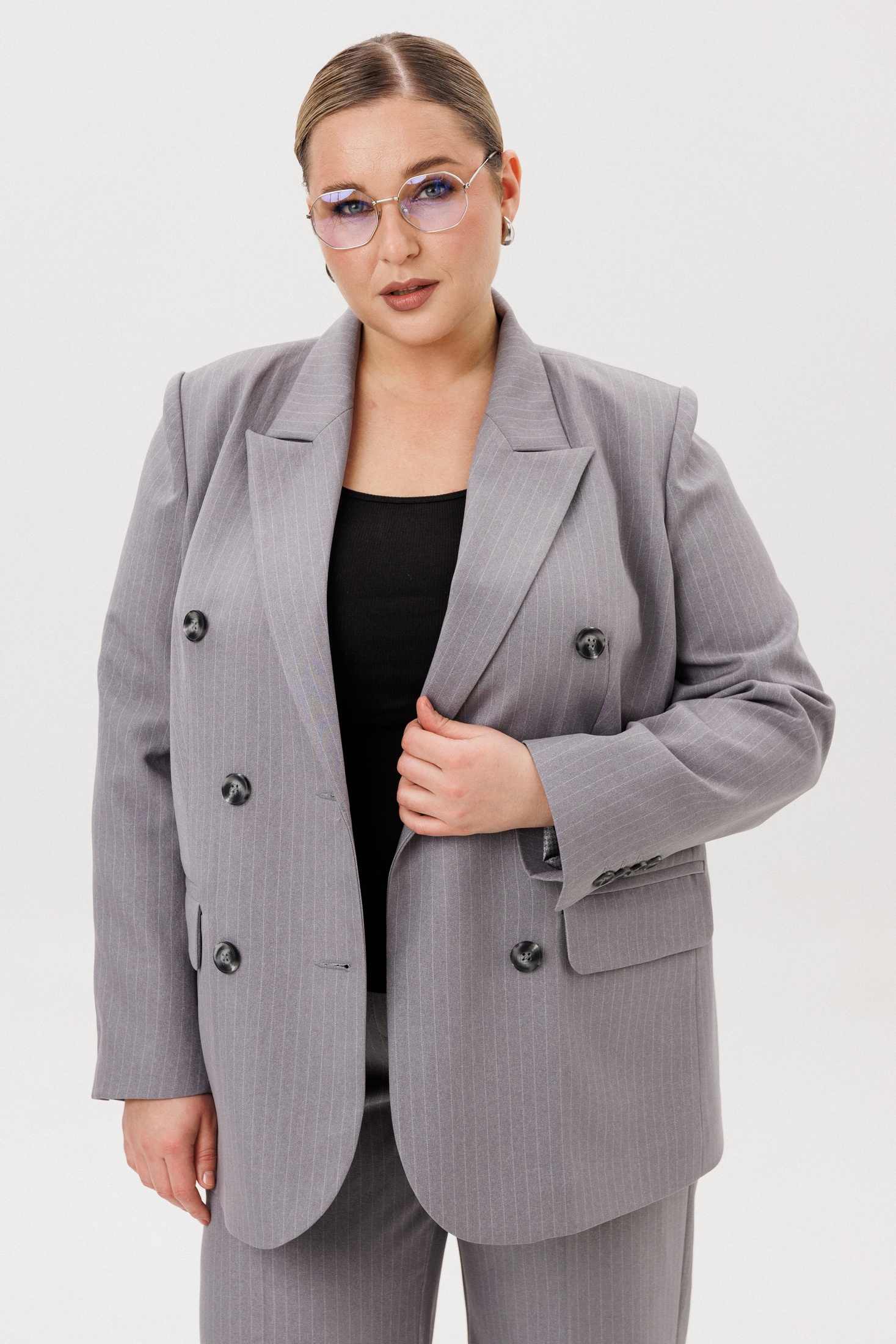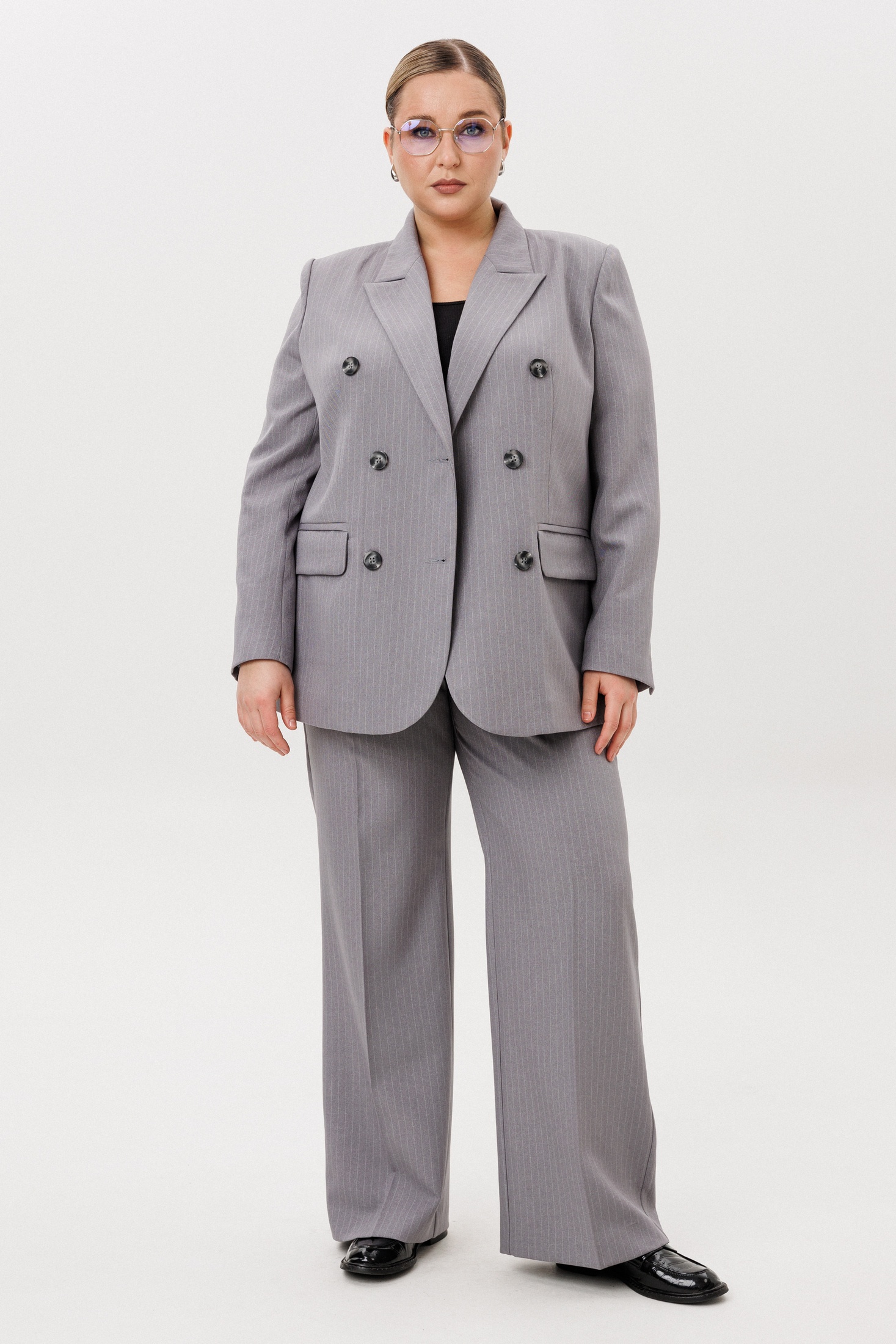Жакет в данном костюме — это двубортная модель, дополненная клапанными карманами, что придает ему изысканный вид. Застежка на пуговицу сочетает в себе функциональность и стиль. Элегантная шлица по рукаву и V-образный вырез подчеркивают женственность образа, а пиджачный воротник добавляет шика.