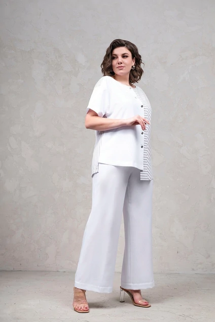 Комплект-двойка: брюки + блуза. Блуза свободного силуэта, длиной до середины бедра, с цельнокроеным коротким рукавом с застежкой на пуговицы. Перед разноуровневой длины. Брюки прямого силуэта без застежки, на резинке. На левой передней половинке брюк выполнена декоративная шлица с разрезом по низу с застежкой на пуговицы.
