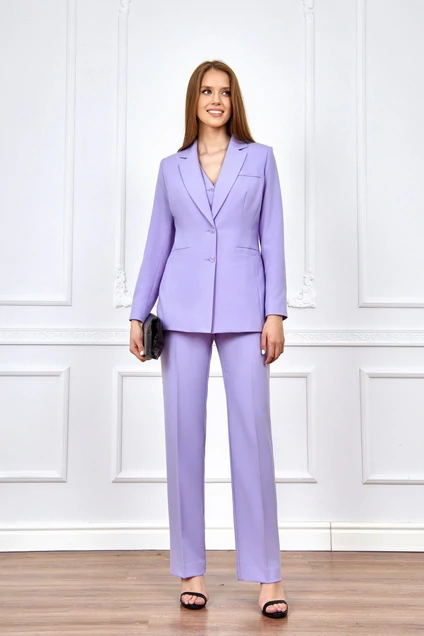 Комплект женский, брючный, состоящий из жакета на подкладке, жилета на подкладке и брюк. Жакет полуприлегающего силуэта втачным рукавом, отложенным воротником с лацканами. По низу рукава –шлица с пуговицами. Жилет классического покроя с V-образным вырезом. Брюки прямые со стрелками, спереди –карманы со скосом.