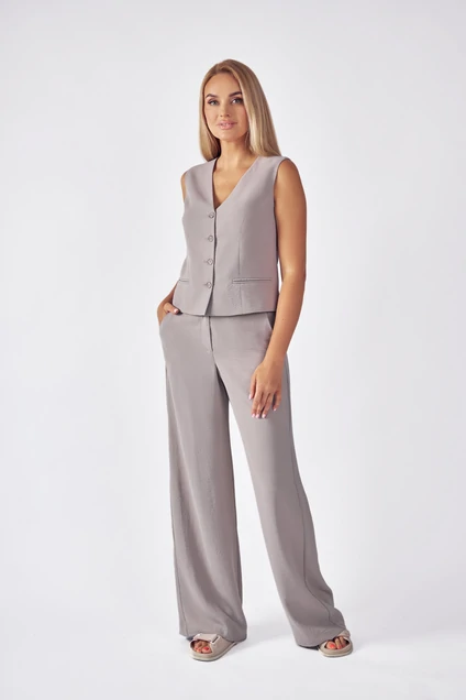 Комплект женский брючный, состоящий из жилета и брюк, из тонкой однотонной ткани с эластаном. Жилет прямой, укороченный с застежкой спереди на петли и пуговицы. Брюки прямые, широкие на поясе с застежкой на молнию спереди , с боковыми карманами.