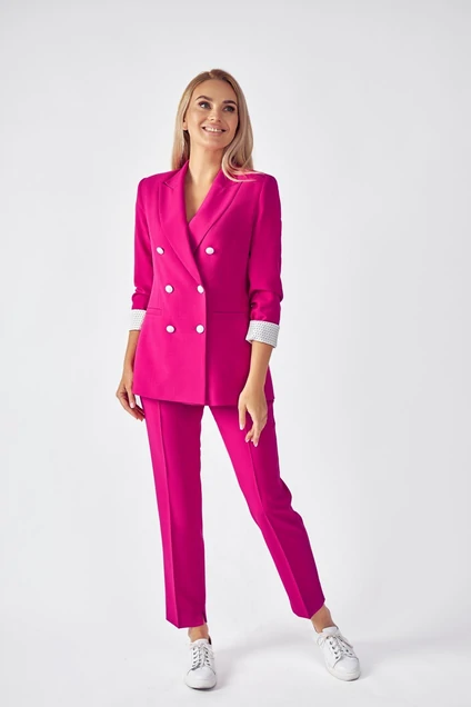 Комплект брючный женский, классический, состоит из жакета и брюк. Жакет полуприлегающего силуэта с втачным рукавом, 2-бортный, воротник с лацканом, спереди два прорезных кармана. По спинке шлица, изделие на подкладке с дизайном(может меняться дизайн). Брюки 7/8 длины ,зауженные книзу, с боковыми карманами, на поясе, спереди застегивается на молнию и потайные пуговицы.