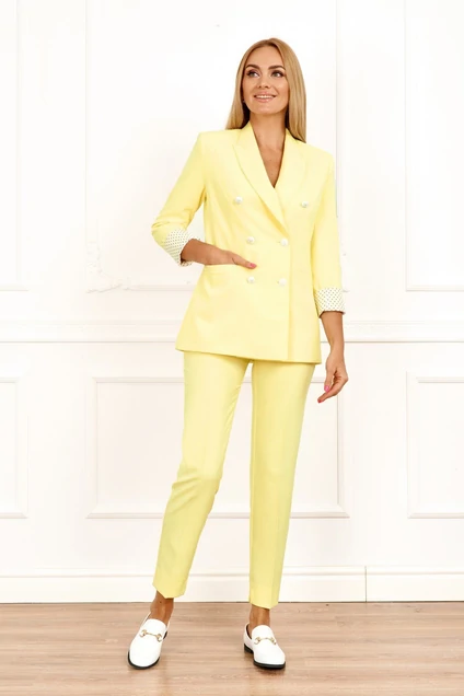 Комплект брючный женский, классический, состоит из жакета и брюк. Жакет полуприлегающего силуэта с втачным рукавом, 2-бортный, воротник с лацканом, спереди два прорезных кармана. По спинке шлица, изделие на подкладке с дизайном(может меняться дизайн). Брюки 7/8 длины ,зауженные книзу, с боковыми карманами, на поясе, спереди застегивается на молнию и потайные пуговицы.