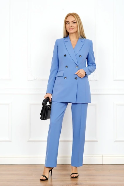 Комплект женский ,брючный из однотонной костюмной ткани. Жакет свободный полуприлегающий ,2-бортный с отложным воротником,по переду-карманы с клапаном ,рукав втачной со шлицей по низу рукава. Изделие на подкладке. Брюки свободные прямые ,на поясе-кокетке с застежкой спереди на молнию и пуговицы ,с боковыми карманами по переду, со складками и стрелками по передним половинкам брюк.