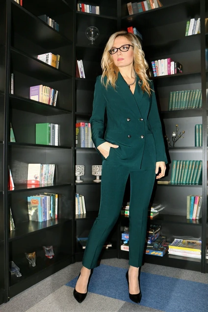 Костюм женский классический, состоит из жакета и брюк. Жакет полуприлегающего силуэта с втачным рукавом, по низу рукава шлица с пуговицами. Спереди два прорезных кармана. По спинке шлица, изделие на подкладке с дизайном (дизайн может меняться). Брюки-зауженные книзу 7/8 длины, с боковыми карманами, на поясе, спереди застегивается на молнию и пуговицы.