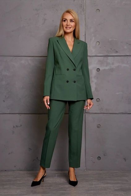 Комплект женский брючный, состоящий из жакета и брюк. Жакет полуприлегающего силуэта до линии бёдер, двубортный, воротник отложной с лацканами, рукав втачной, застёжка спереди на петли и пуговицы, по переду-прорезные карманы с листочкой, спинка со средним швом и рельефами, изделие на подкладке. Брюки классические, со стрелками, зауженные к низу, на поясе-кокетке, застёжка спереди на молнию и пуговицы, боковые карманы со скосом.