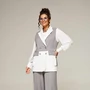 По боковым швам блузы имеются высокие разрезы, отстроченные декоративной, широкой отделочной строчкой.