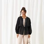 Блуза отрезная по лини талии с декоративными вставками в нижней части, которые задают силуэтное расширение в области бедер.Нижний край блузы неровный.