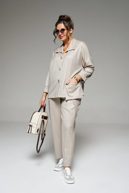 Стильный повседневный женский костюм в винтажном стиле дополненный акцентным накладным карманом весьма актуален в будущем сезоне. Предметы костюма можно смело комбинировать по отдельности с другими вещами гардероба. Костюм состоит из 2-х предметов одежды: рубашки и брюк. Выполнен из костюмной ткани стильного дизайна «елочка».