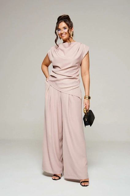 Брюки широкие фантазийного кроя со встречной складкой спереди от пояса. Высота посадки стандартная. В верхней части бокового шва предусмотрены функциональные карманы. Застежка боковая на потайную молнию слева.