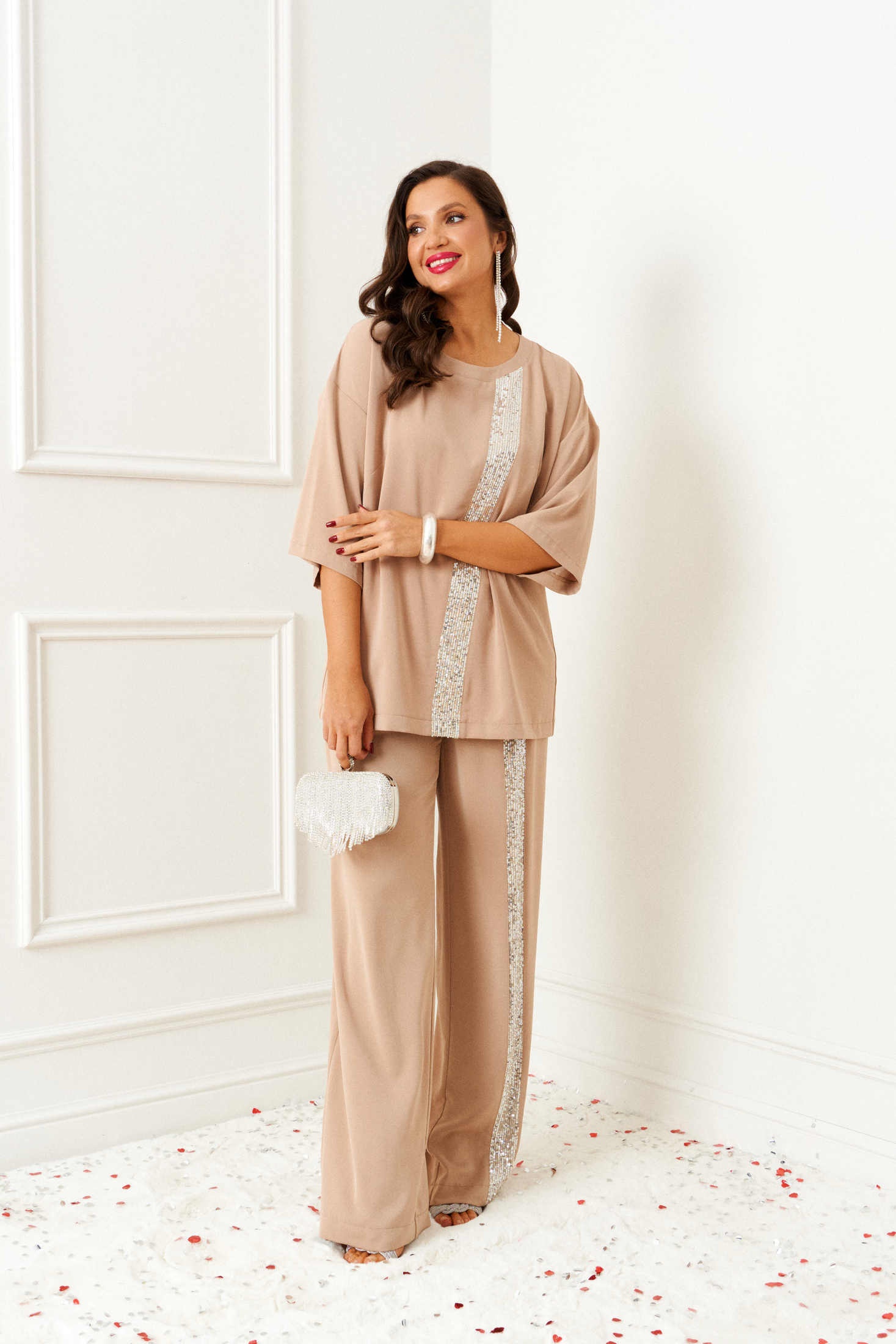 Блузка свободного силуэта, с удлиненной линией плеча, длиной до середины бедра. Передняя часть с двумя нагрудными вытачками и с фигурной отделочной вставкой из ткани с пайетками по центру. Спинка цельная. Рукав одношовный, средней ширины, длиной ниже локтя. Горловина овальной формы на подрезной обтачке.