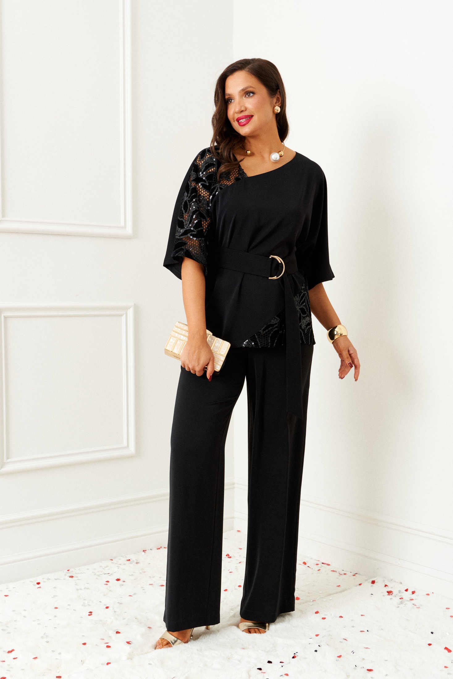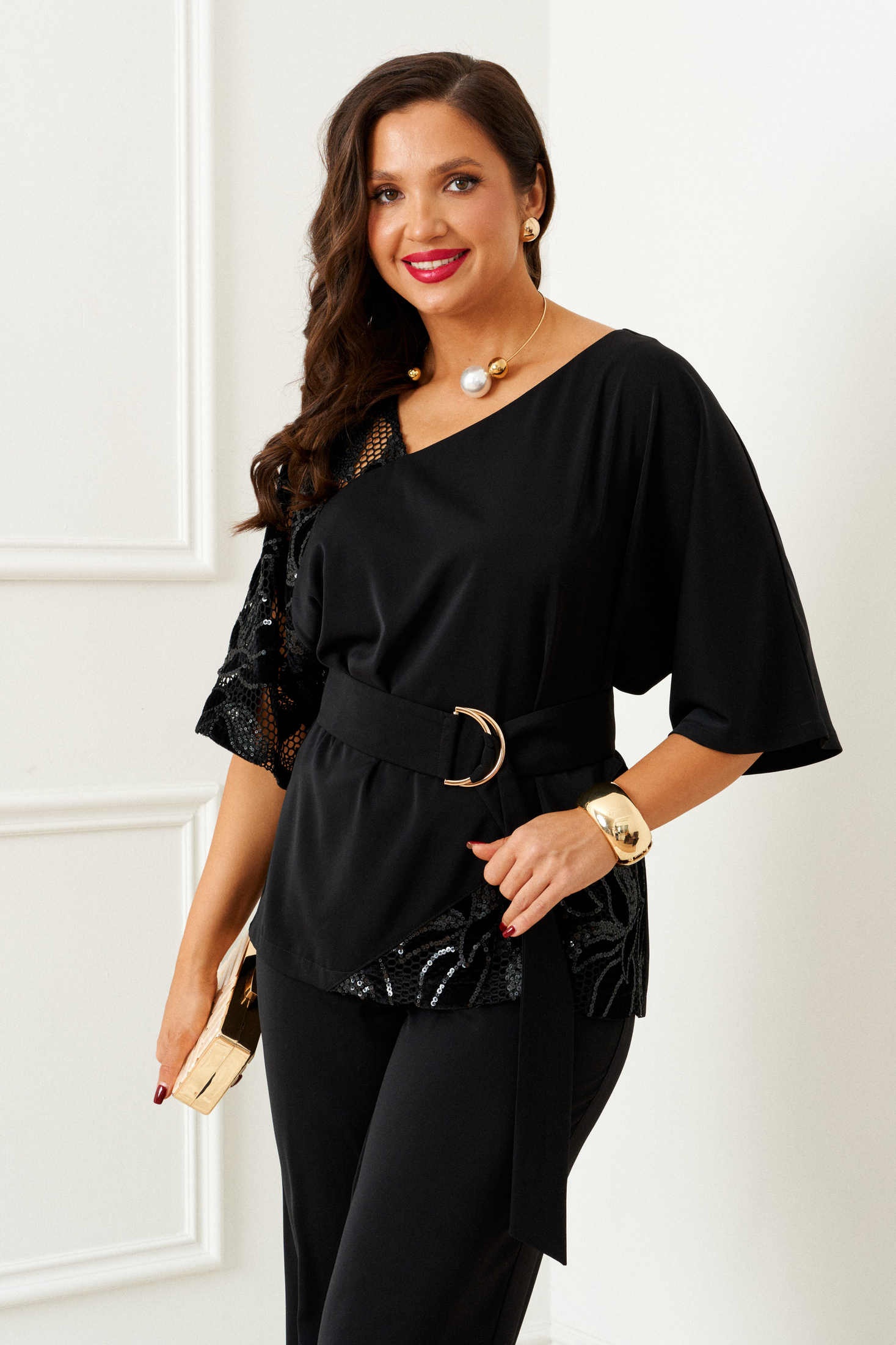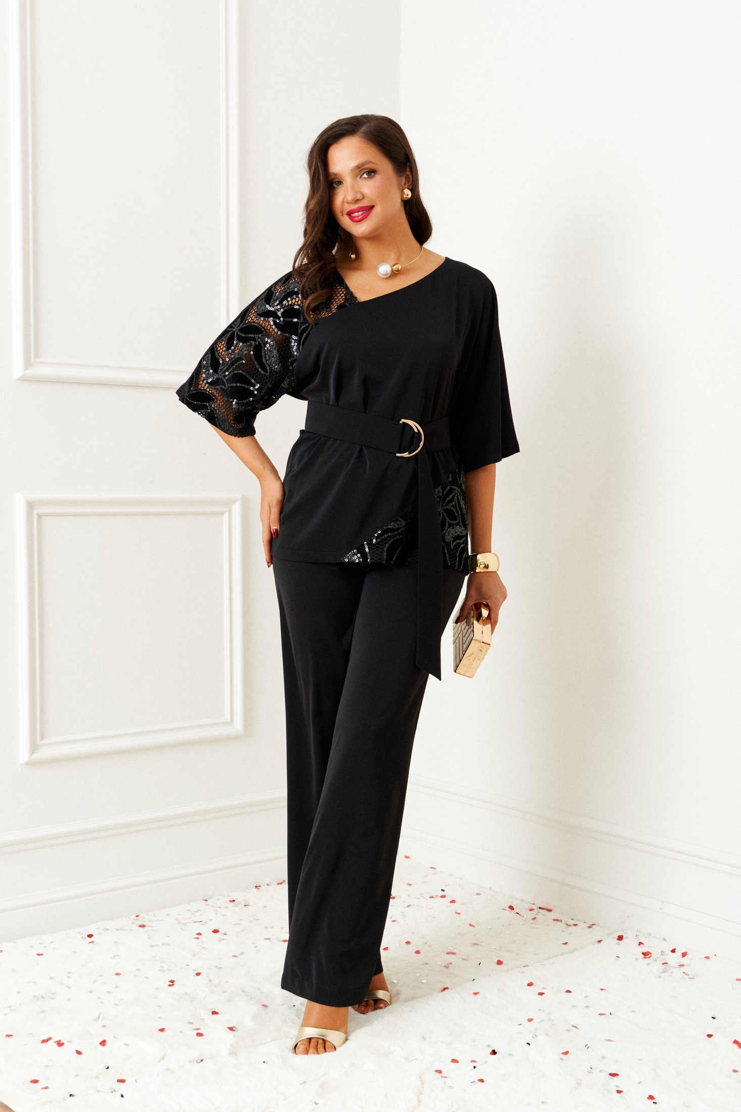 Изысканный костюм состоит из 2-ух предметов: блузки и брюк. Выполнен из эластичного полотна в сочетании с кружевом. Основная ткань нежная, гладко-бархатистой фактуры, приятная на ощупь, она легко драпируется и очень выгодно и дорого подчёркивает образ; отделочная ткань придает праздничный шарм.