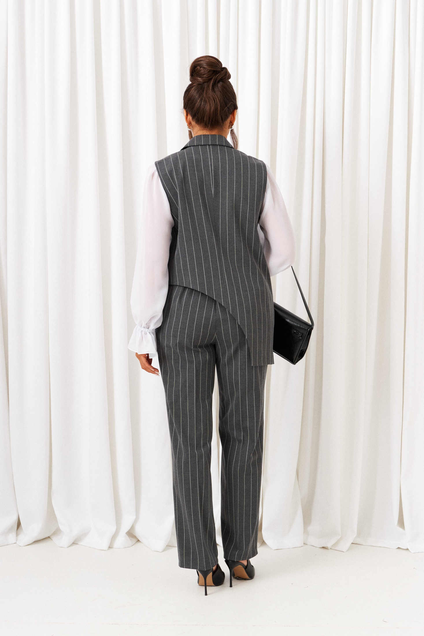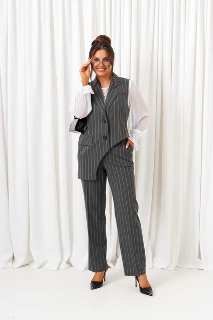 Костюм брючный 6422 полоска серая Beautiful&Free — идеальный выбор для делового гардероба. Коллекция бренда Beautiful&Free сочетает в себе элегантность и комфорт. Выполнен из костюмной ткани с полосатым принтом, костюм включает в себя асимметричный жилет, брюки и блузку из шифона. Жилет с классическим воротником, центральной застежкой на пуговицы и функциональными карманами, добавляет стильности. Брюки прямого кроя с карманами обеспечат удобную посадку благодаря резинке в поясе. Легкая блузка с длинными рукавами и резинкой на манжетах подчеркивает женственность образа. Комплект идеален для офисного или делового стиля в любое время года.