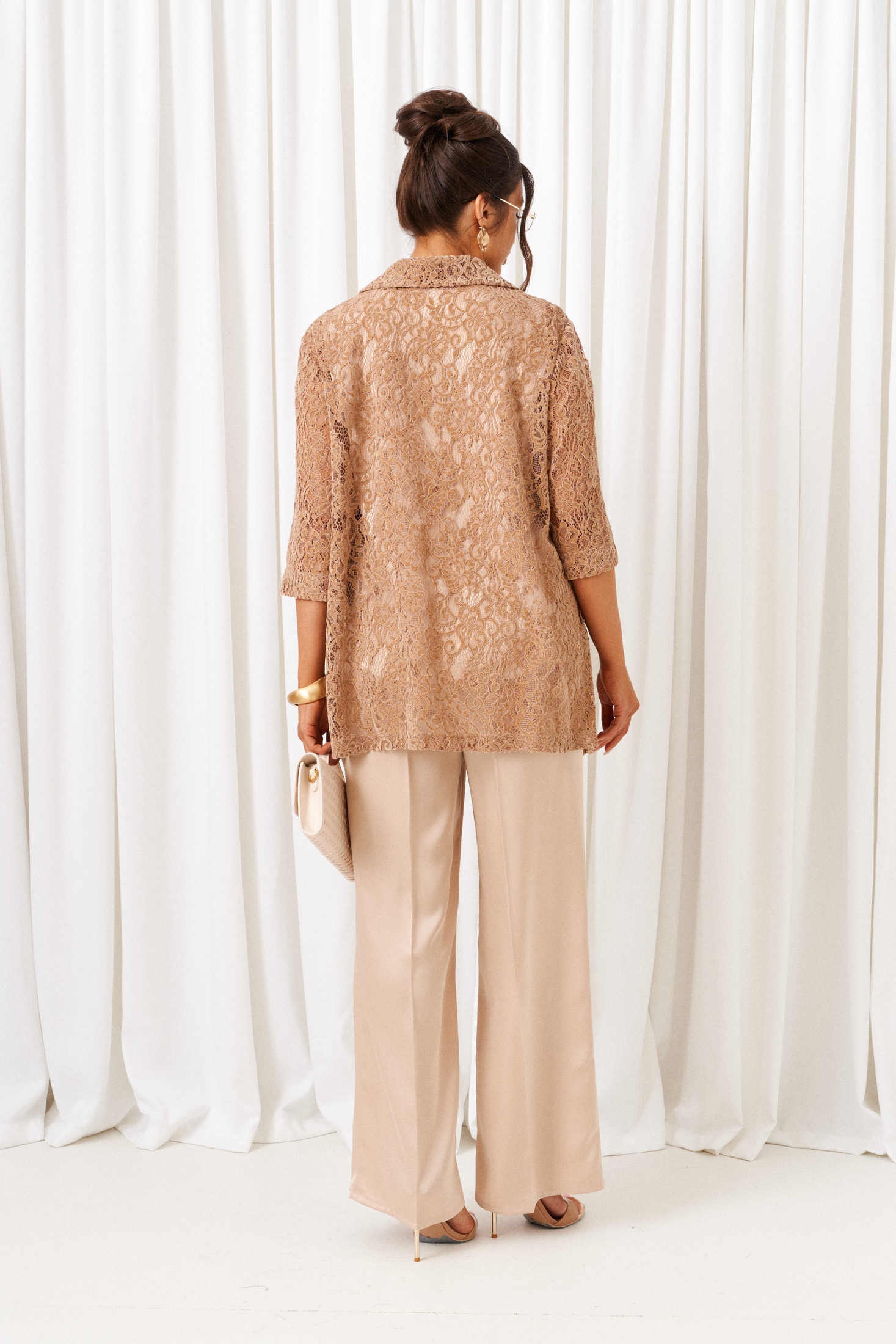 Костюм брючный 6425 бежевый Beautiful&Free. Коллекция бренда Beautiful&Free представляет утончённый комплект, включающий кружевную блузку, брюки и топ. Изделие выполнено из смесового вискозного полотна, что придаёт ему мягкость и комфорт. Блузка свободного силуэта имеет классический стояче-отложной воротник и высокие разрезы по бокам, что добавляет элегантности. Брюки с классической высокой посадкой и молнией на поясе идут в комплекте с функциональными боковыми карманами. Цвет бежевый, что делает костюм универсальным для разных сезонов и случаев, от повседневных выходов до торжественных событий. Длина блузки по спинке составляет 74 см, что обеспечивает удобную посадку. Это идеальный выбор для тех, кто ценит стиль и комфорт в любом сезоне. Длина рукава блузки (от плечевой точки до низа) ~ 41 см. Длина топа (по среднему шву спинки) ~ 62-63 см. Длина брюк (по боковому шву с поясом) ~ 108 см.