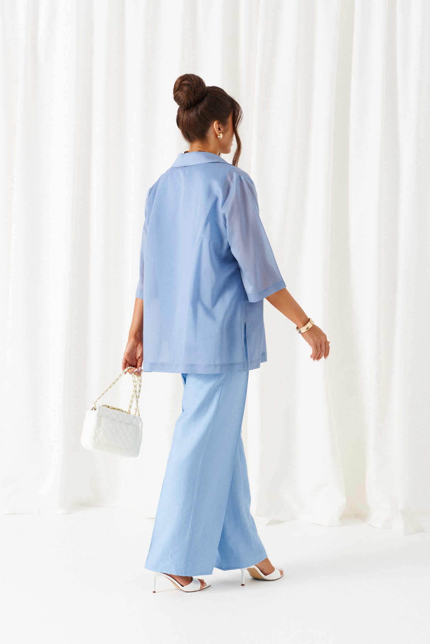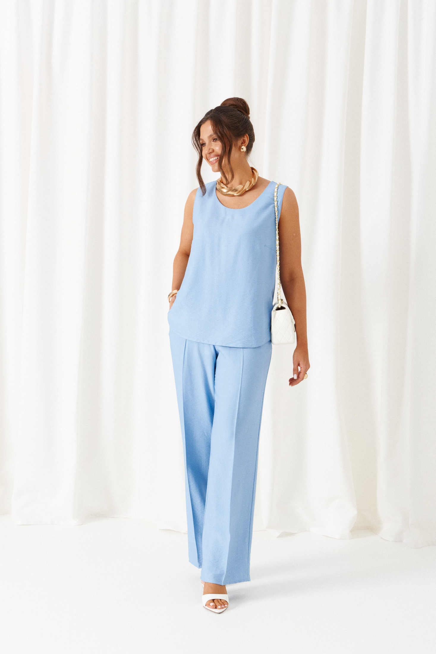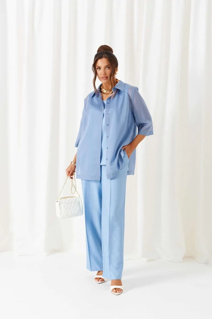 Комплект с блузкой из вуали, льняных брюк и топа – изделие вне времени и трендов, созданное в различных интерпретациях: от оверсайза до классики. Предназначен для повседневного и выходного использования. Найдет применение в жаркую и прохладную летнюю погоду.