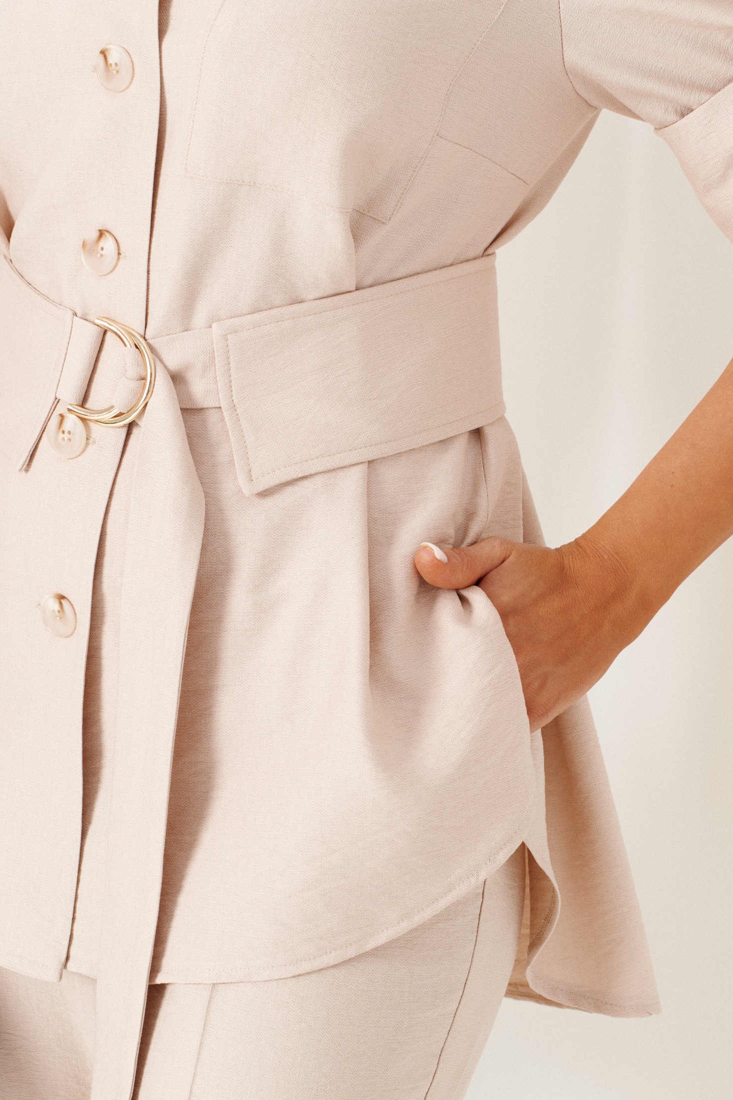 Костюм брючный 6450 бежевый Beautiful&Free — это универсальное решение для повседневного и выходного образа. Коллекция бренда Beautiful&Free сочетает в себе функциональность и стиль. Костюм выполнен из смеси льна и вискозы, что обеспечивает отличную воздухопроницаемость и комфорт в летний период. Блузка свободного кроя с воротником стояче-отложного типа, оснащена накладным карманом и центральной застежкой на пуговицы. Длина блузки по спинке составляет 77 см, а рукава — 30 см. Брюки классической посадки с длиной 107 см имеют застежку на молнию и пуговицу. Фантазийный пояс с изящной пряжкой дополняет образ. Бежевый цвет костюма подойдёт для различных мероприятий, будь то офис или прогулка.