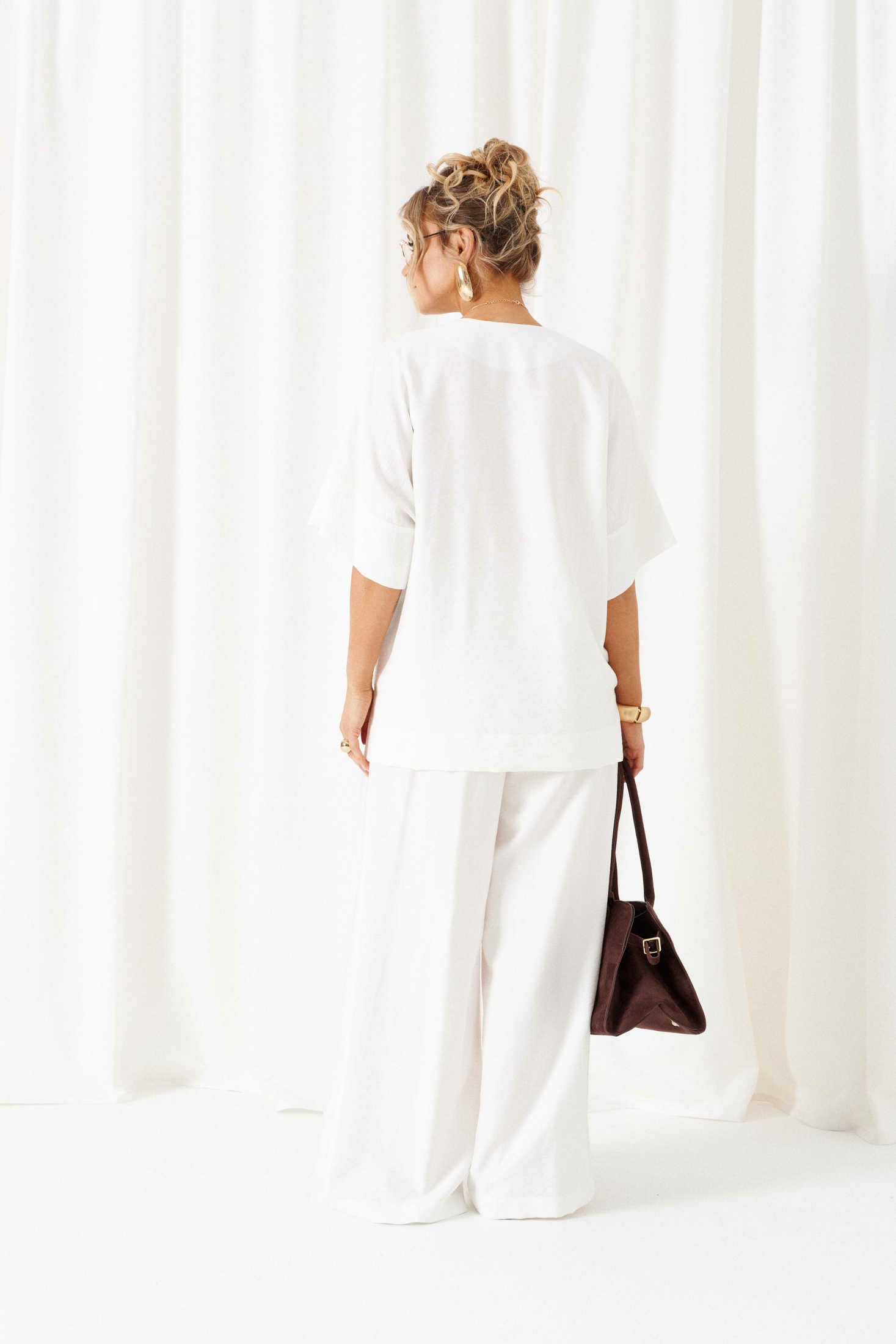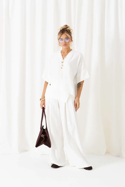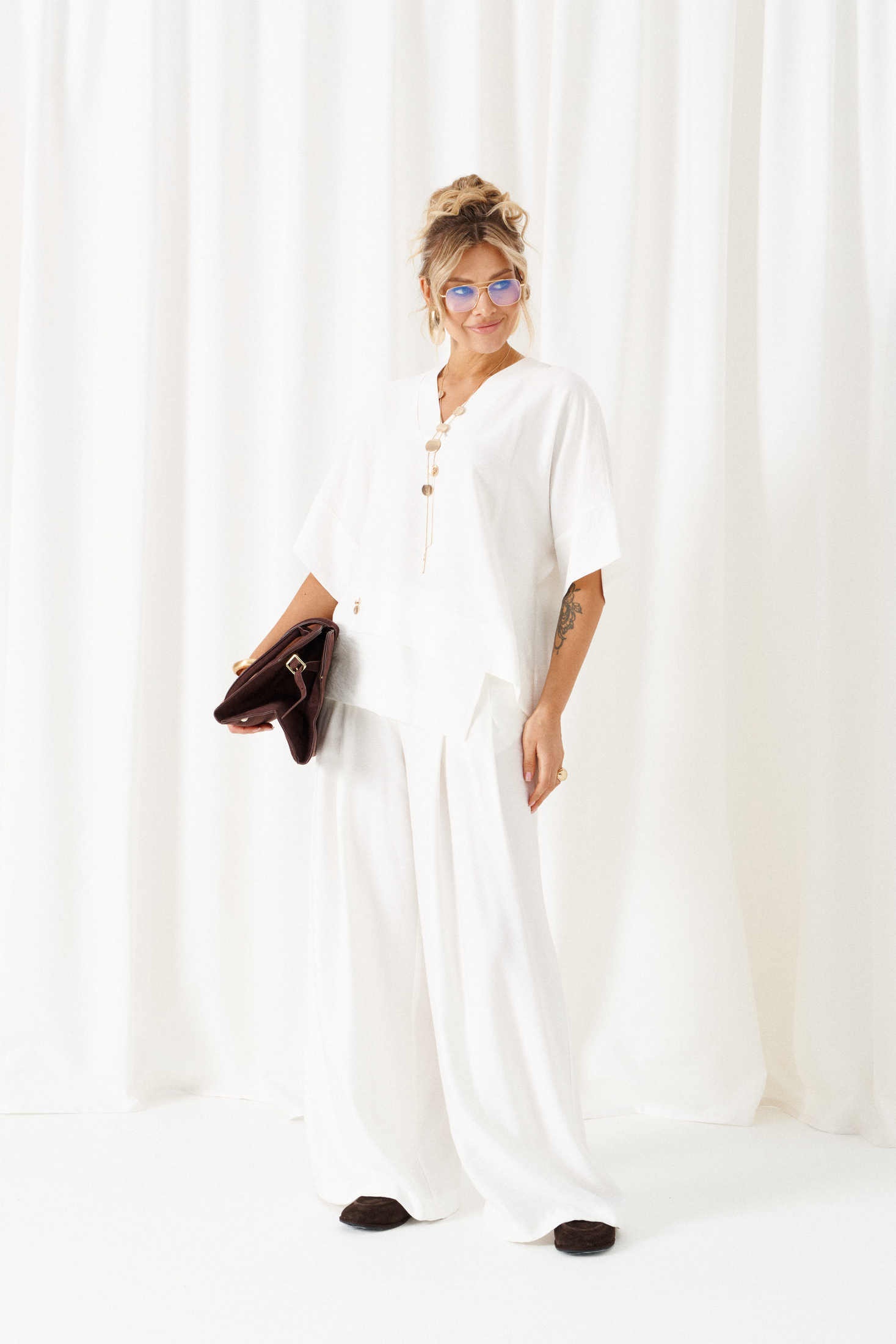 Костюм брючный 6470 белый Beautiful&Free — это изысканный женский костюм из льняной смесовой ткани, который подарит комфорт в повседневной жизни. Коллекция бренда Beautiful&Free предлагает уникальный дизайн с акцентными деталями. Материал из 80% льна и 20% вискозы обеспечивает мягкость и практичность в носке. Блузон свободного кроя с удлинённой линией плеча и асимметричным подрезом подчеркнет вашу индивидуальность. V-образный вырез и планки по горловине добавляют элегантности. Брюки прямого фасона, с карманами и центральной застежкой на молнию, обеспечат удобство и стильный вид. Белый цвет и универсальный крой делают костюм идеальным выбором для летних дней и делового стиля. Длина блузона по спинке — 75 см, длина брюк — 110 см.