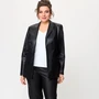 Комплект 2-х предметный состоит из жакета и и брюк. Жакет женский удлиненный, из текстильной ткани, на подкладке, полуприлегающего силуэта с центральной бортовой застежкой на пуговицы до линии перегиба лацкана. Спереди рельефные швы от плечевого шва, отрезной бочок и карман с клапаном. Спинка с рельефами от плечевого шва. Рукав втачной, двухшовный, по низу рукава обработана шлицана петли-пуговицы. Воротник пиджачного типа. Длина по спинке 66 см, длина рукава 62 см. Брюки классические, прямые, слегка заужены к низу,заутюжены стрелки, по переду обработаны карманы с отрезным бочком, застежка на тесьму-молнию и 1 пуговицу. На задних половинках обработаны вытачки и имитация карманов с листочкой, пояс в брюках притачной. Длина брюк от талии по боковому шву 103 см.