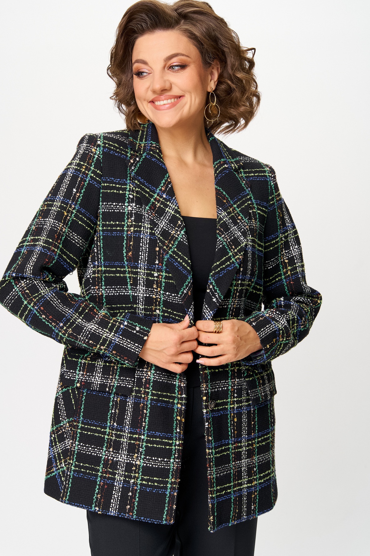 Комплект женский-двойка,из костюмной ткани, жакет удлиненный, свободного силуэта с центральной бортовой застежкой на пуговицы до линии перегиба лацкана. По переду имеется отрезной бочок и вертикальные вытачки. С прорезными карманами с клапаном и двумя обтачками. Спинка цельная. Воротник пиджачного типа. Рукав двухшовный, втачной. Жакет на подкладке. Длина рукава 63 см, длина по спинке 75 см. Брюки прямые, классические, из текстильной ткани, с заутюженными стрелками, по переду обработаны карманы с отрезным бочком, застежка на тесьму-молнию и 1 пуговицу. На задних половинках обработаны вытачки и имитация карманов с листочкой, пояс в брюках притачной. Длина брюк от талии по боковому шву 103 см.