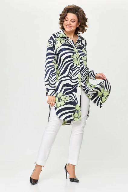 Рубашка свободного силуэта, удлиненная с центральной застежкой по пуговицы, воротник рубашечный с отрезной стойкой, нижняя часть спинки по центру со складкой. Рукава втачные двухшовные с манжетом по низу. Манжет застегивается на петли пуговицы.