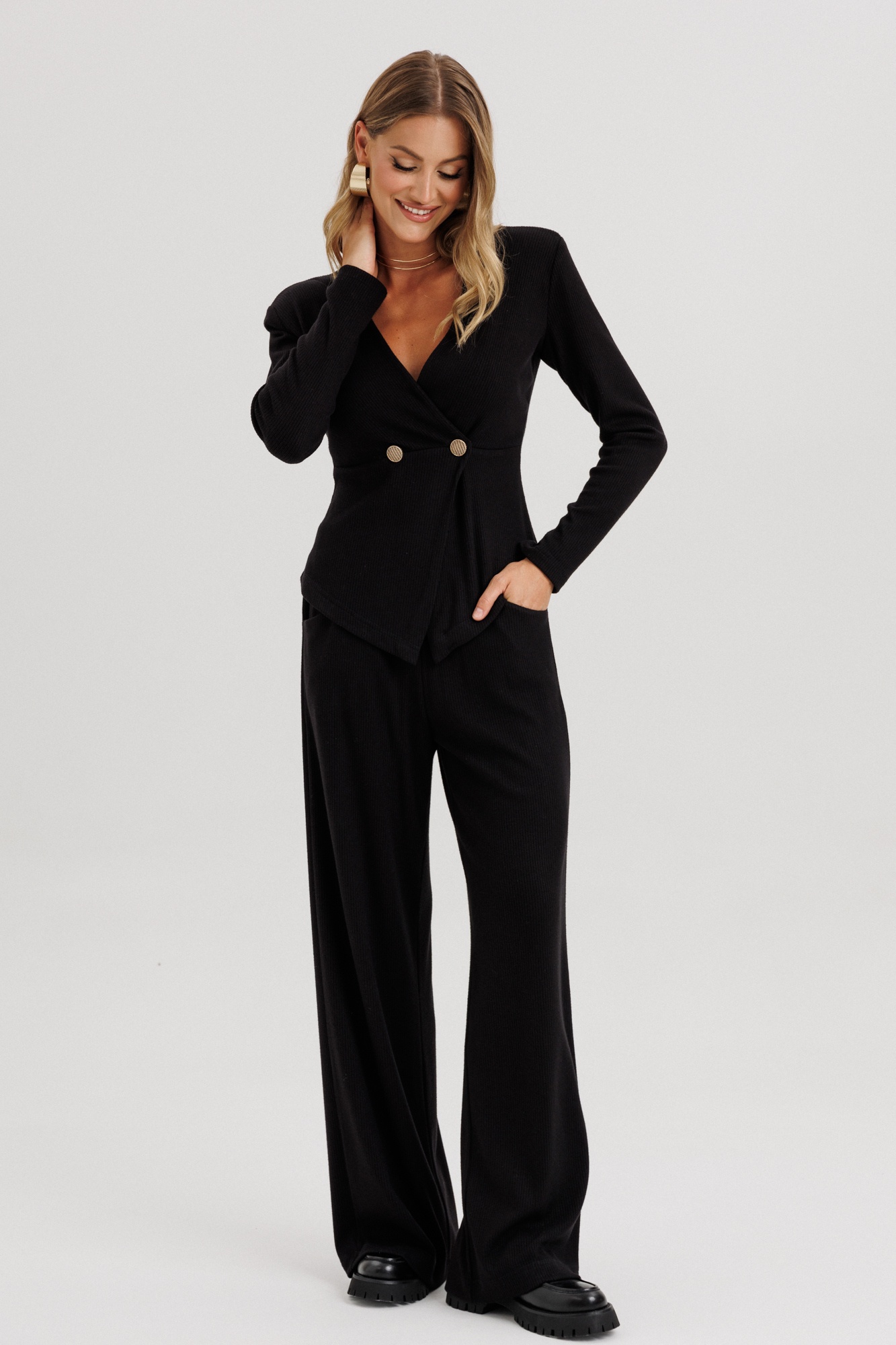 Костюм женский трикотажный, состоящий из джемпера и брюк. Джемпер прилегающего силуэта с двубортной застежкой, застегивающейся на 2 петли и пуговицы. Перед - с подрезом под грудью, в котором обработаны петли. Линия низа переда – углом. Спинка без конструктивных элементов. Рукава втачные одношовные длинные. Вырез горловины V-образный. Брюки с поясом на резинке, расширены книзу. На передних половинках брюк обработаны округлые карманы.