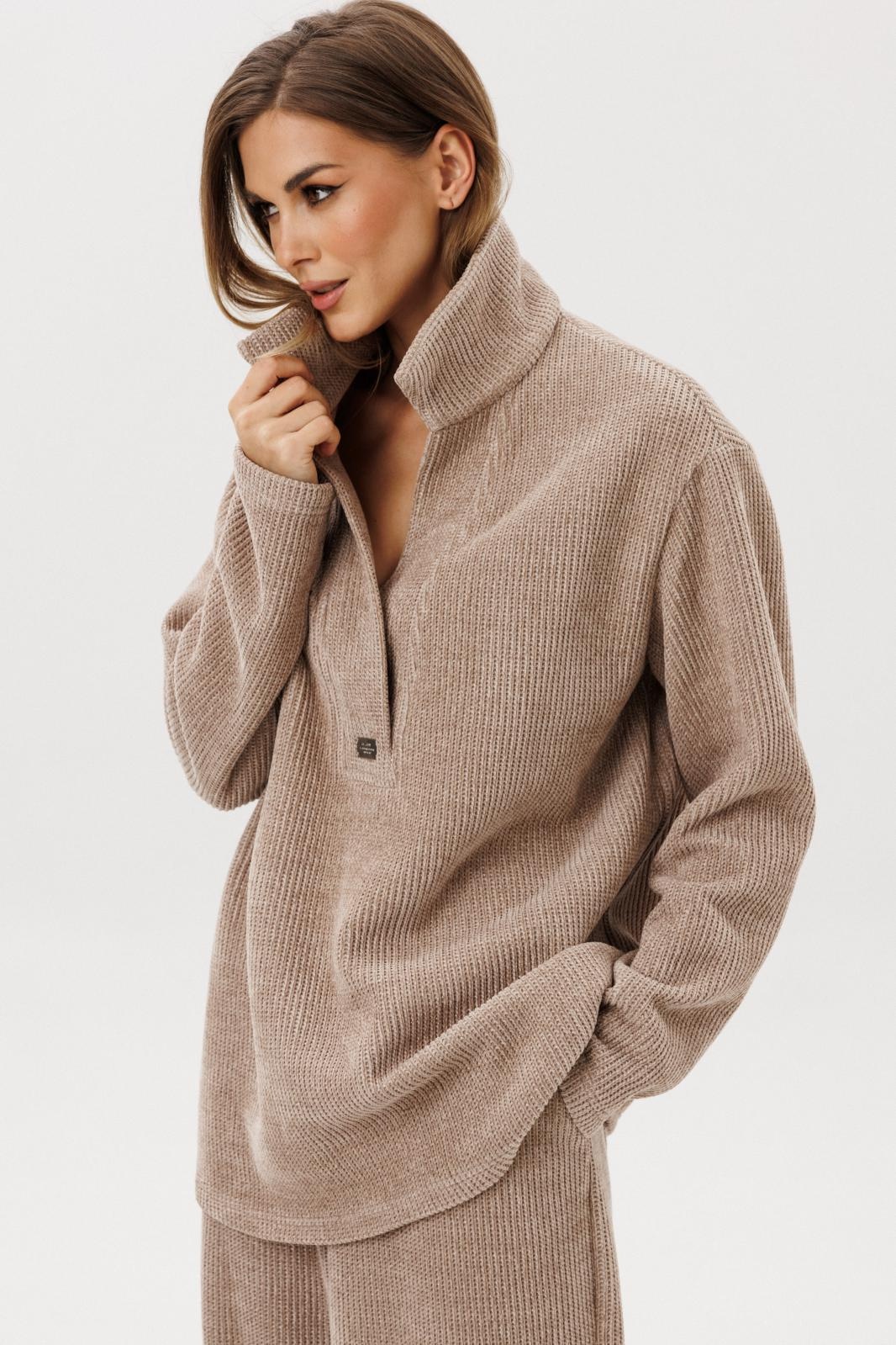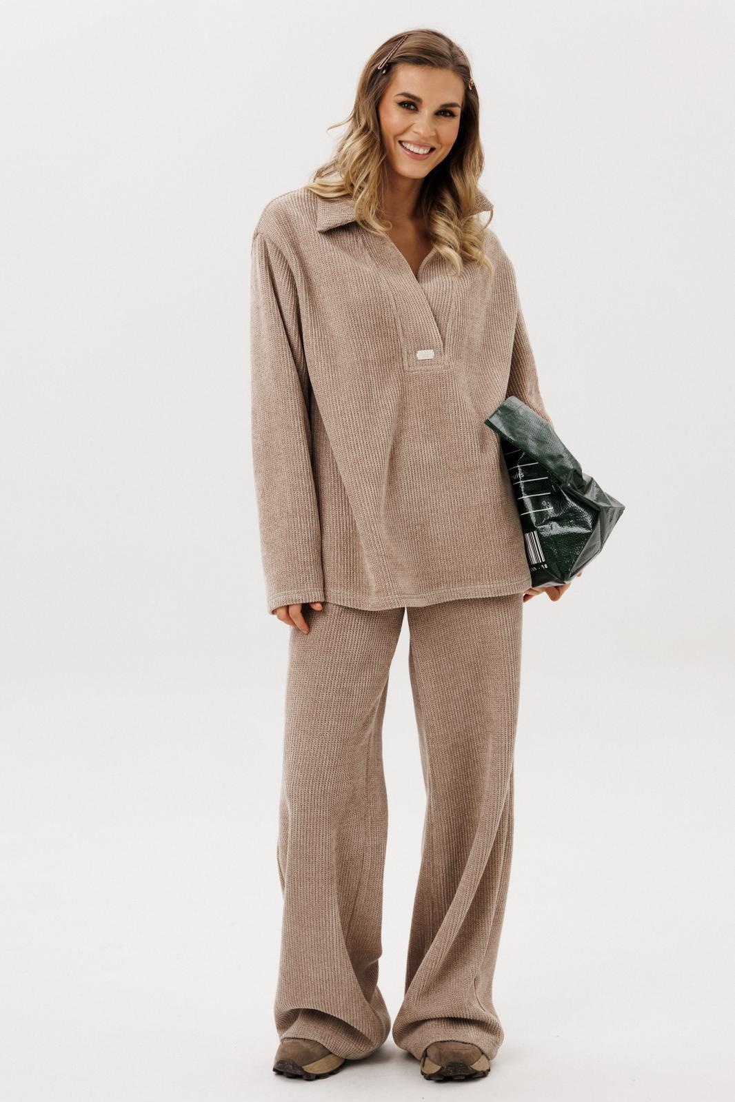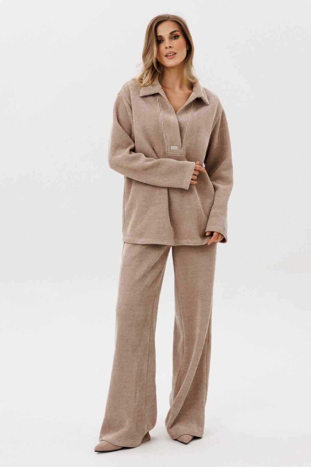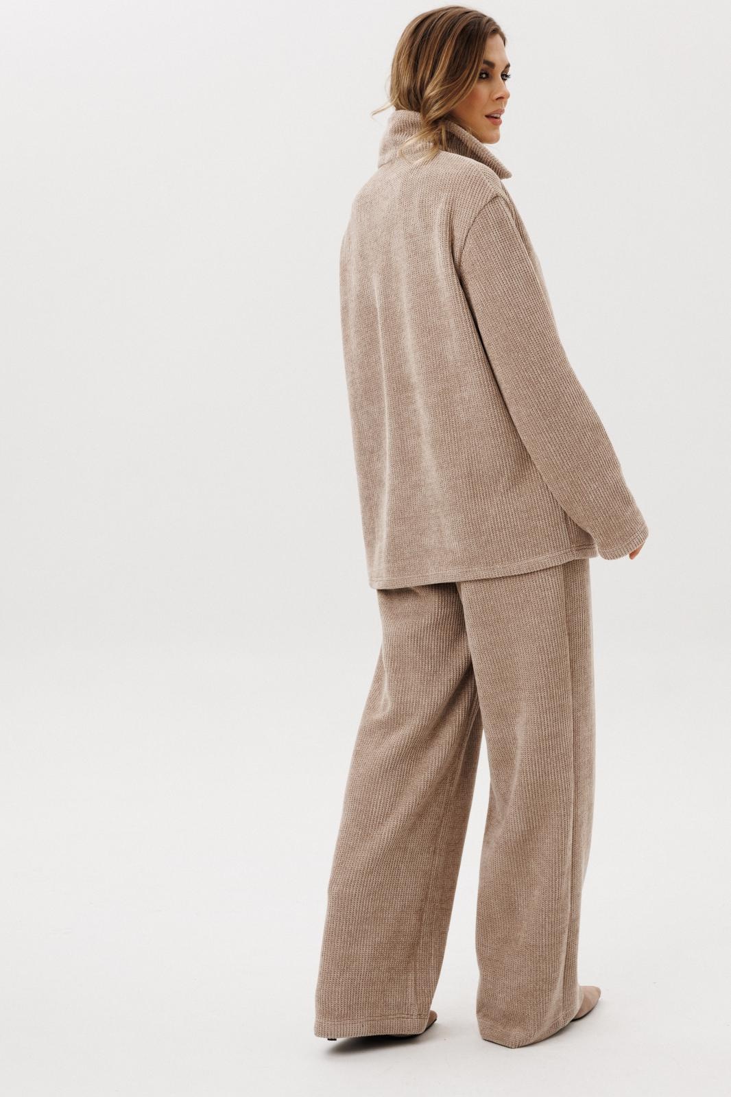 Костюм женский трикотажный, состоящий из джемпера и брюк. Перед с вырезом по горловине, обработанным широкими планками. Внизу планки расположена декоративная металлическая пластинка. декоративная металлическая пластинка. Спинка без конструктивных элементов. Воротник стояче-отложной. Рукава рубашечного типа одношовные длинные. Брюки с притачным поясом на резинке, расширенные книзу. На передних половинках обработаны боковые карманы.
