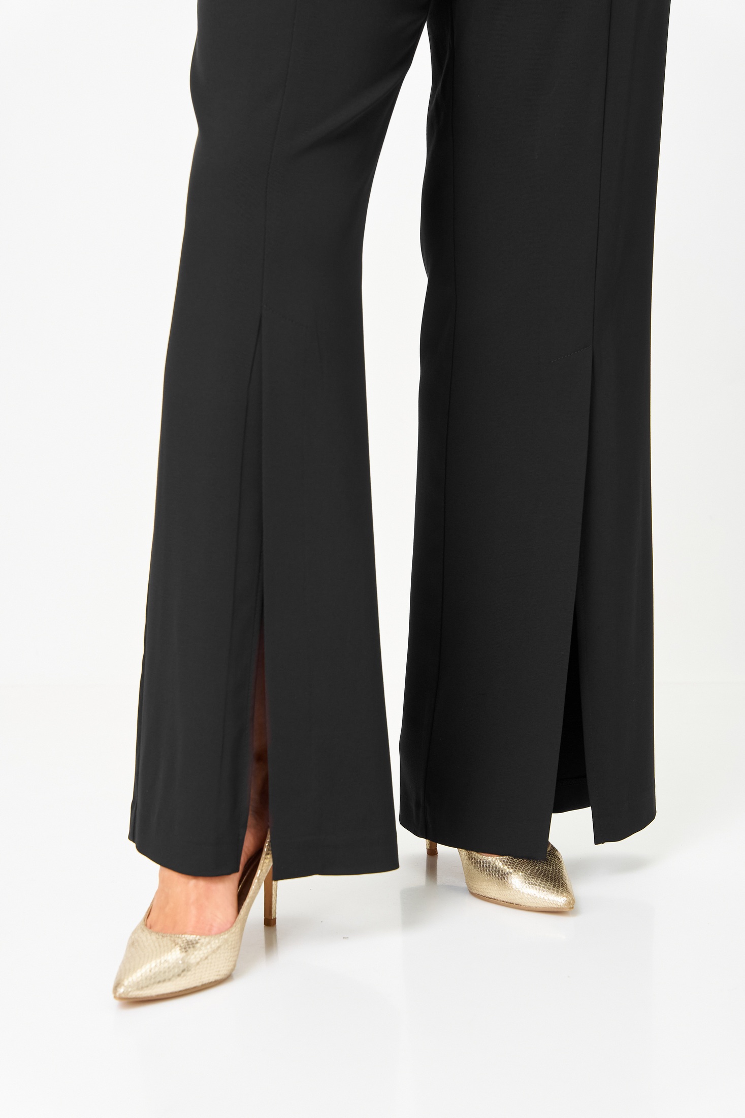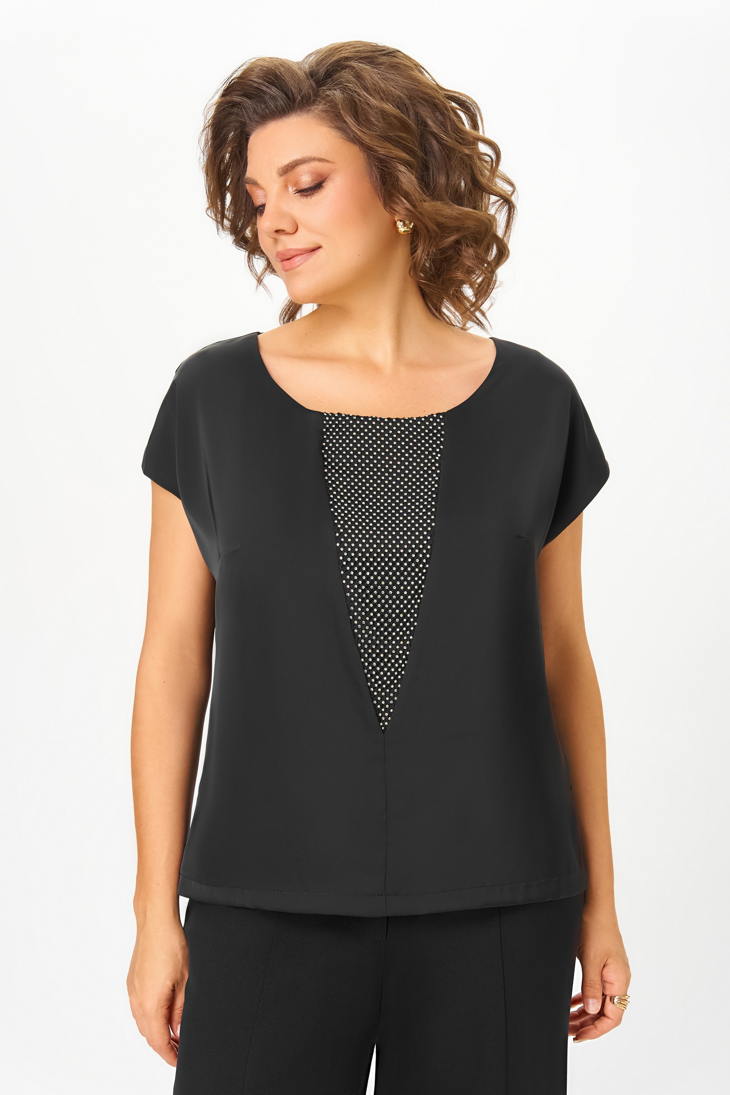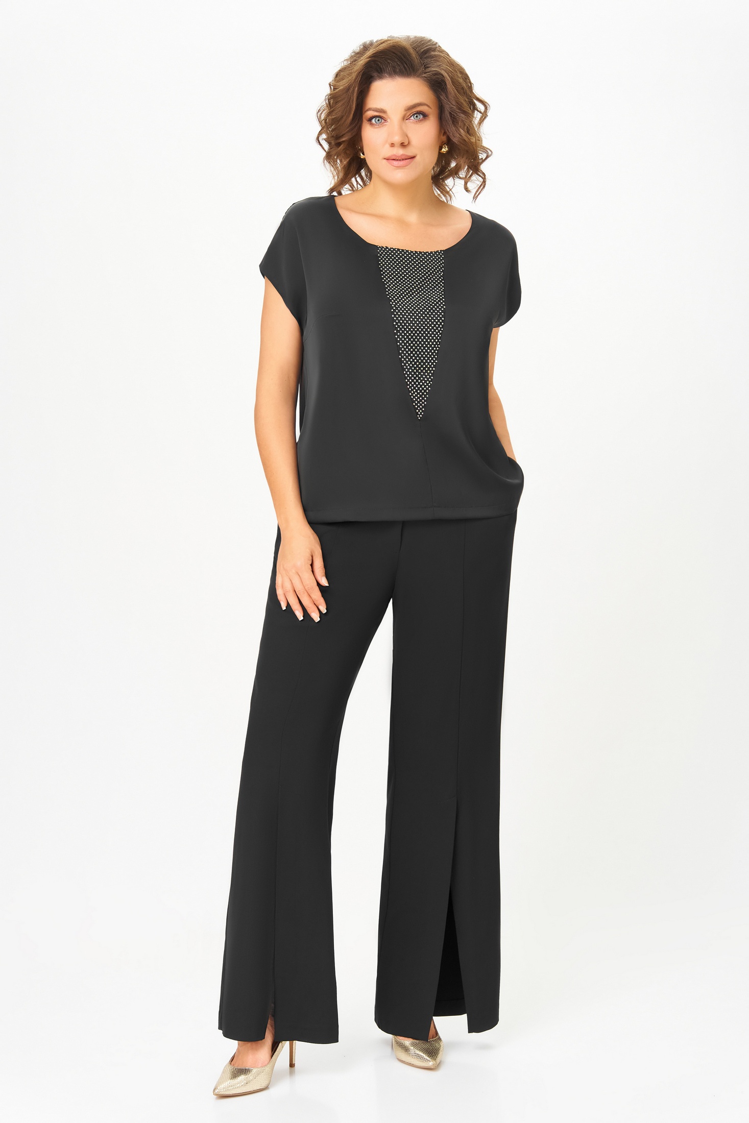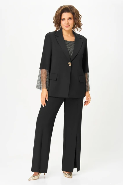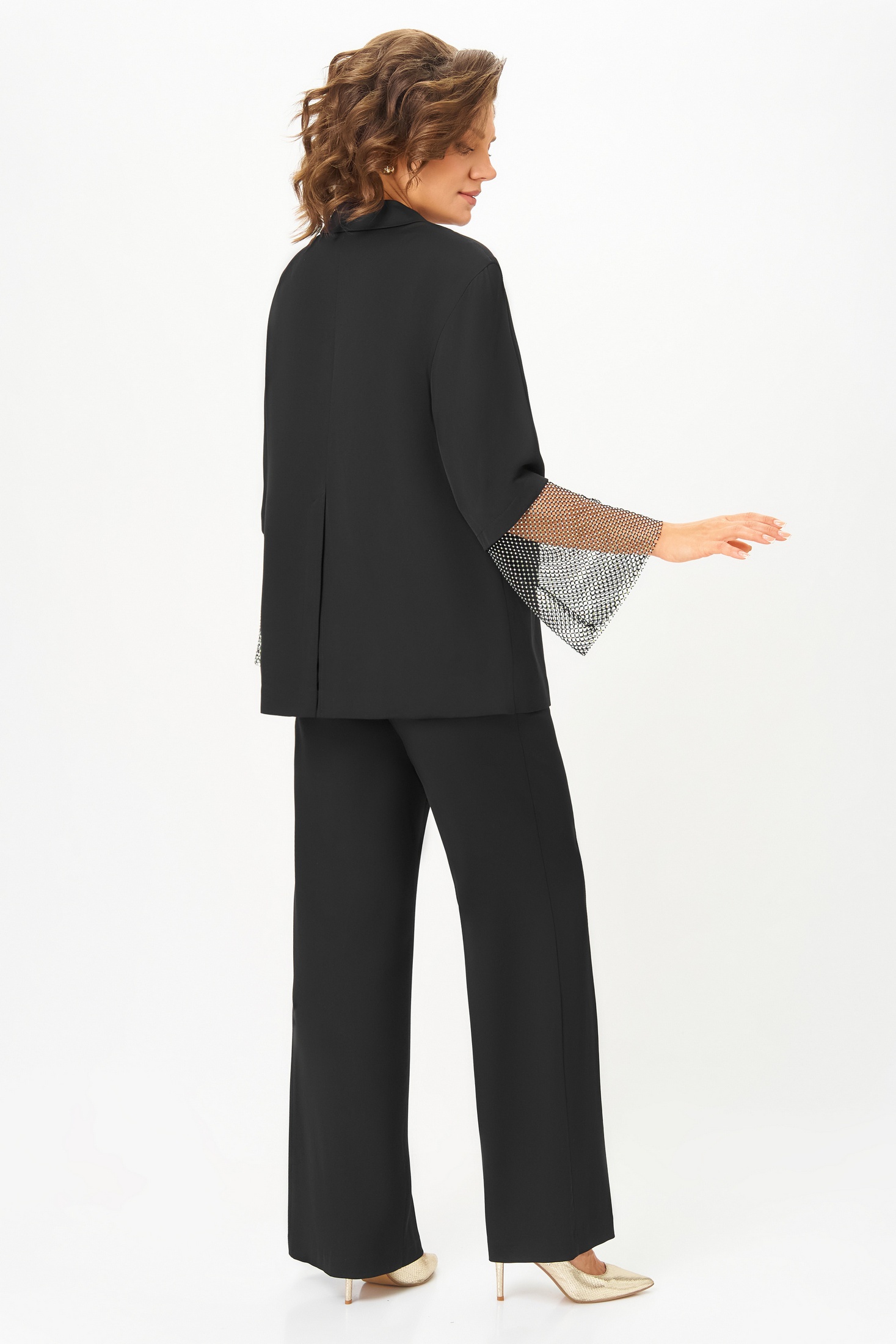Элегантный женский брючный костюм черного цвета, идеально подходящий для официальных мероприятий и деловых встреч. Костюм включает в себя три предмета: жакет, топ и брюки. Длина жакета 74 см, он оснащен ровным силуэтом с легко приталенным кроем, дополнен обтянутыми пуговицами на передней панели, что придает строгость и элегантность образу. Рукава жакета украшены уникальными вставками из сетчатого материала с металлическим блеском, добавляющие изысканности и современной привлекательности. Топ под жакетом длинной 61 см, выполнен из тонкой ткани, представляющей собой превосходное дополнение под строгий жакет, не перегружая образ. Брюки длинной 111 см, с классическим прямым кроем идеально дополняют костюм, обеспечивая комфорт и свободу движений на протяжении всего дня. Простота и изящество линий подчеркивают статус и вкус их владелицы. Этот костюм — идеальный выбор для тех, кто ценит качество, стиль и удобство.