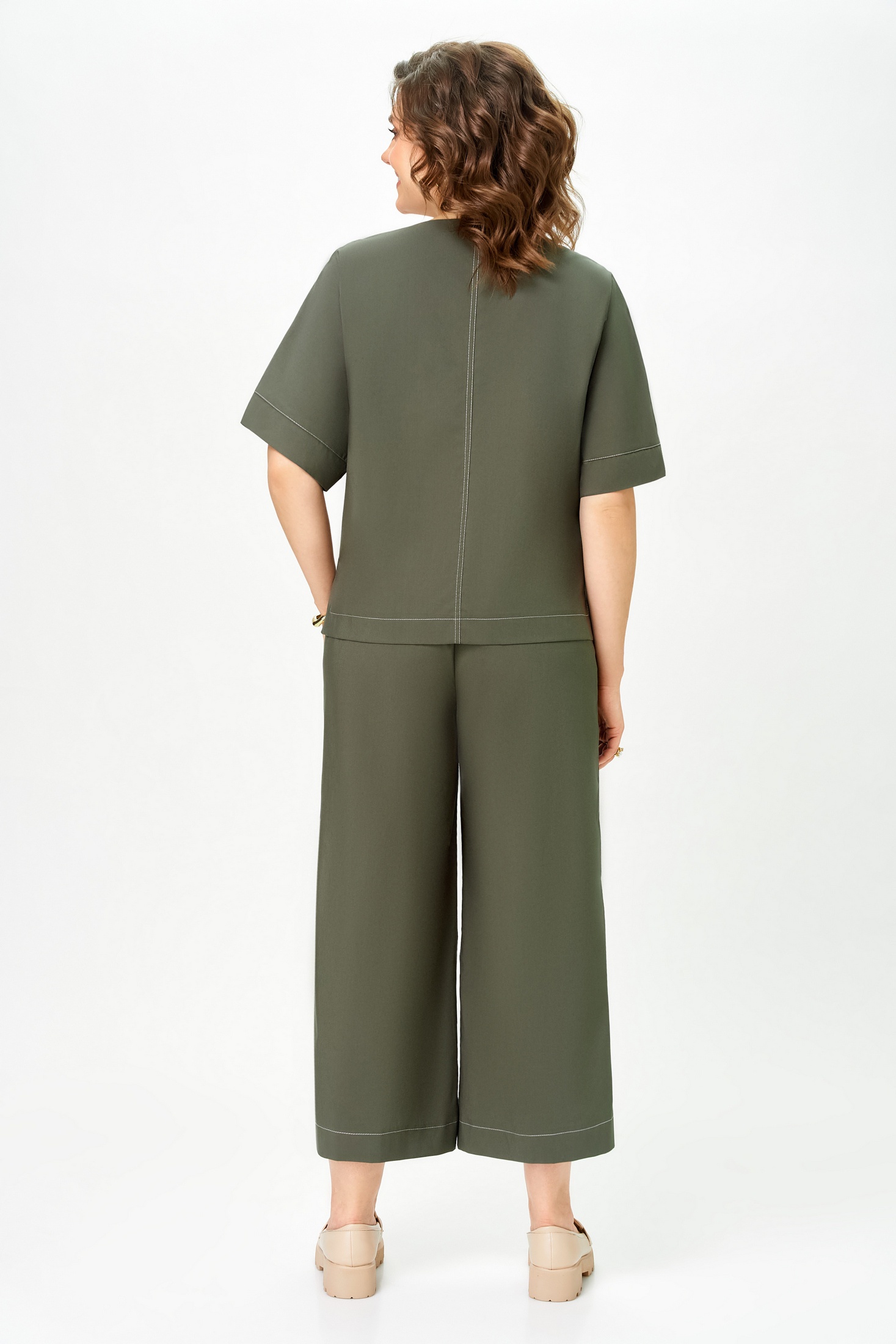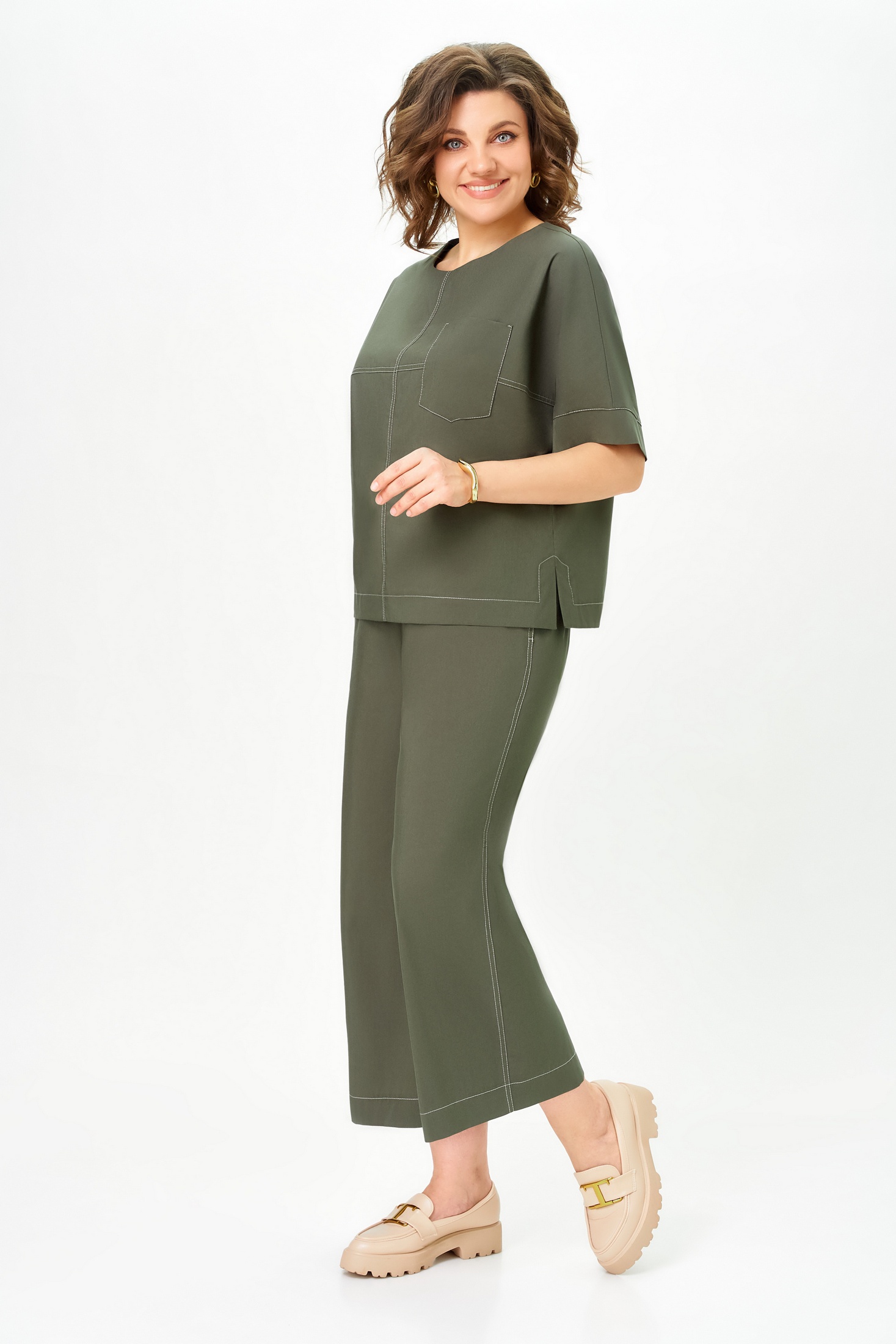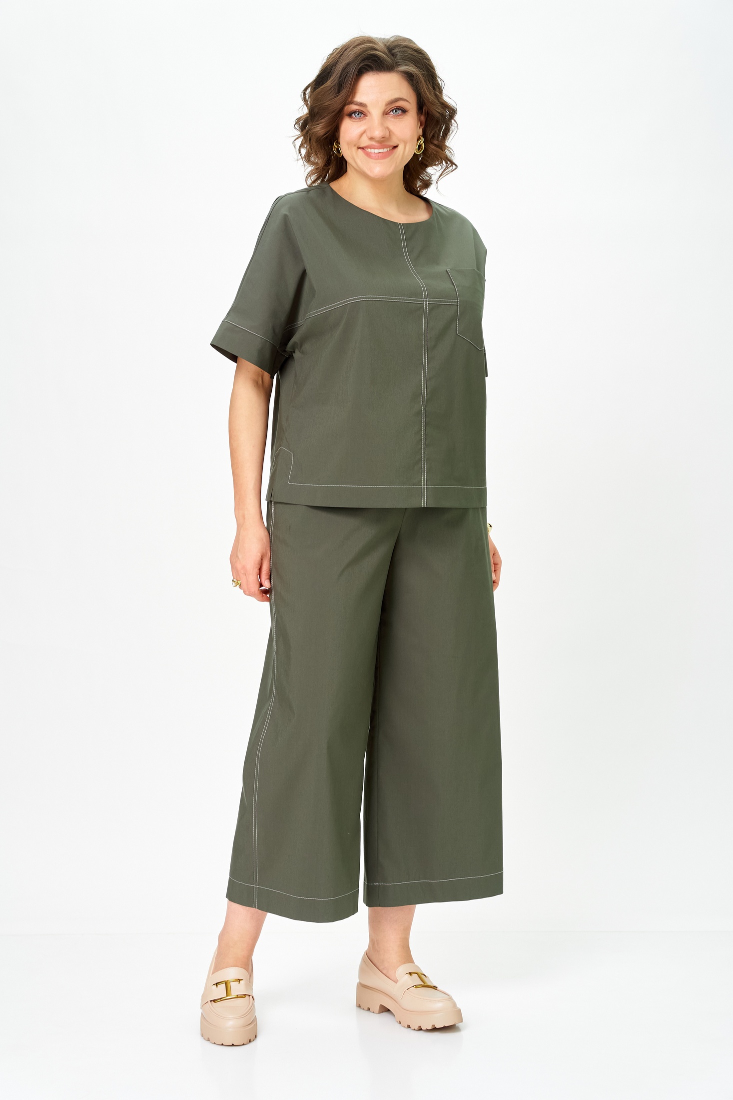 Костюм брючный 7082-2 хаки Дали предлагает современное сочетание комфорта и стиля. Коллекция бренда Дали выполнена из хлопка, полиэстера и спандекса, обеспечивая мягкость и лёгкость движения. Блузка прямого силуэта с рукавами длиной до локтя и покроем «летучая мышь» дополнена центральным швом и накладным карманом на груди. Брюки прямые, широкие и укороченные, идеально подходят для тёплого сезона, поддерживая повседневный стиль. Эластичная тесьма и шнур по талии добавляют комфорт, а контрастные отделочные строчки подчёркивают уникальность дизайна. Хаки цвет костюма делает его универсальным выбором для любого гардероба.