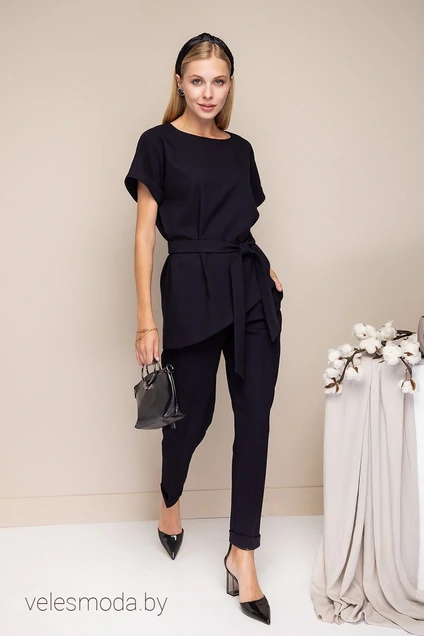 Жакет-жилет из мягкой экошерсти, со спущенным плечом и отложной манжентой по низу проймы. Низ жакета асимметричный. Жакет комплектуется съемным поясом из основной ткани. Бруки на подкройном поясе, с застежкой на две пуговицы и тесьму-молнию. Брюки зауженные, со стрелками и манжетой по низу.