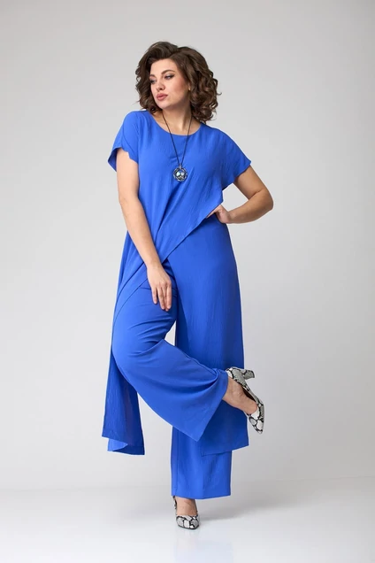 Шикарный комплект из длинной туники и брюк из плательной ткани креп-креш с эластаном. Эффектная туника свободного силуэта, с глубокими разрезами по переду и спинке на запах , великолепно подчёркивает все формы и линии, умело скрывает небольшие несовершенства фигуры и делает пропорции максимально гармоничными и естественными. Горловина округлая, обработана обтачкой, линия плеча приспущена, короткий рукав на основе цельнокроеного. Модель изящно ложится по фигуре, визуально удлиняя силуэт. Стильные широкие брюки «палаццо» с классической посадкой на талию. Пояс притачной на эластичной тесьме-резинке. Приятная ткань, отличная посадка по фигуре позволит выглядеть стильно и модно.